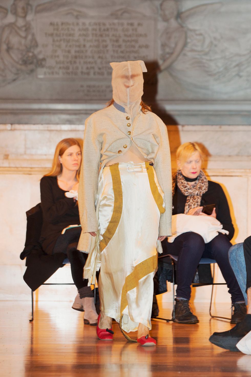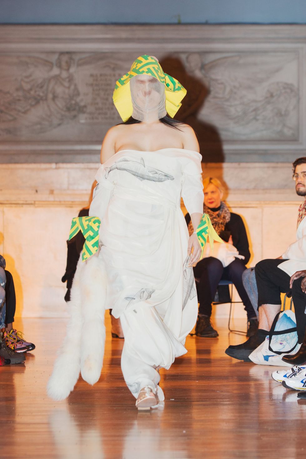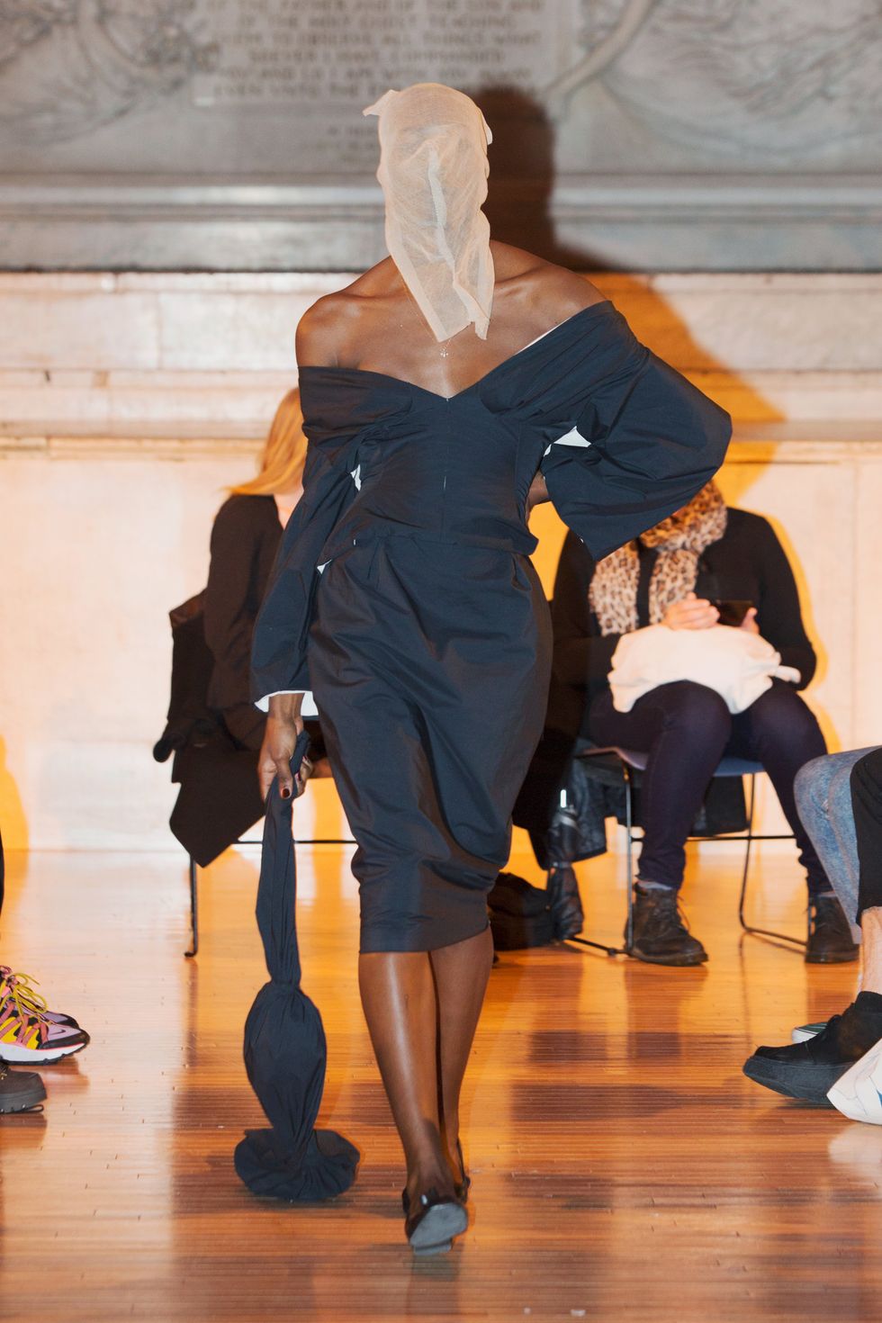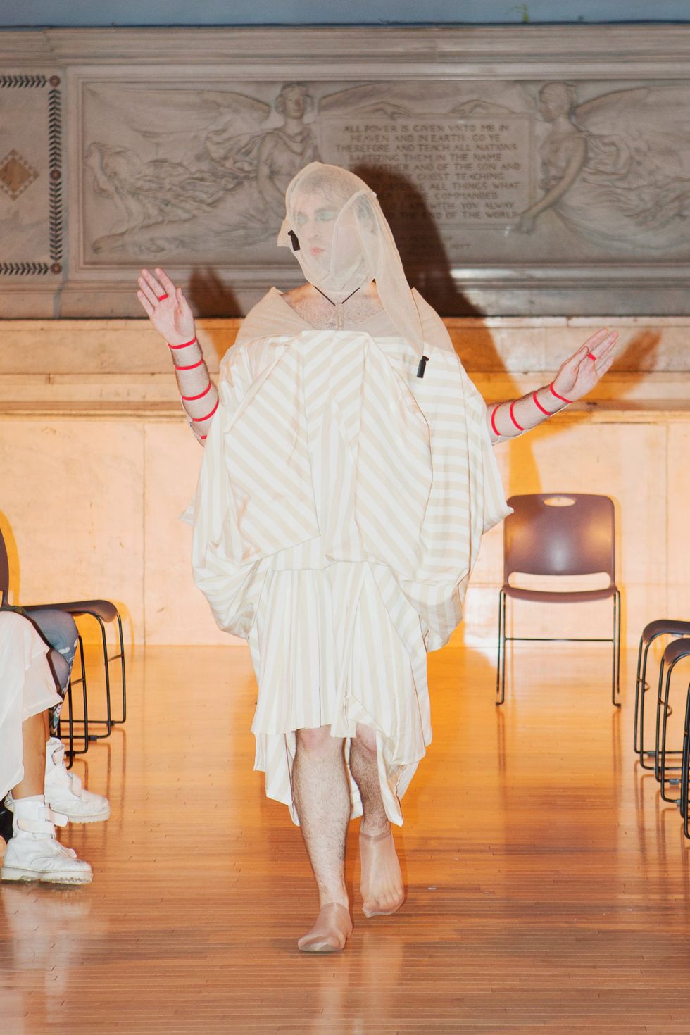 Indeed Gogo's collaged, knotted or inscrutibly draped ensembles, worn by mostly trans models of diverse body types, were celestial under the church's high baby blue ceilings and marble frieze adorned walls. The models wore dyed head coverings and flat shoes, walking at processional speed through a snaking pathway of plastic chairs, which gave the show a feel of an AA meeting for angels or Greek deities. But thanks to a mix that included clips from a documentary about female body builders in which one recites her pre-show mantra, gagaku Japanese court music, video game soundtracks, orchestral love songs, and computer generated voice-overs, the hallucinatory effect transcended any recognizable realm, human or mythic.