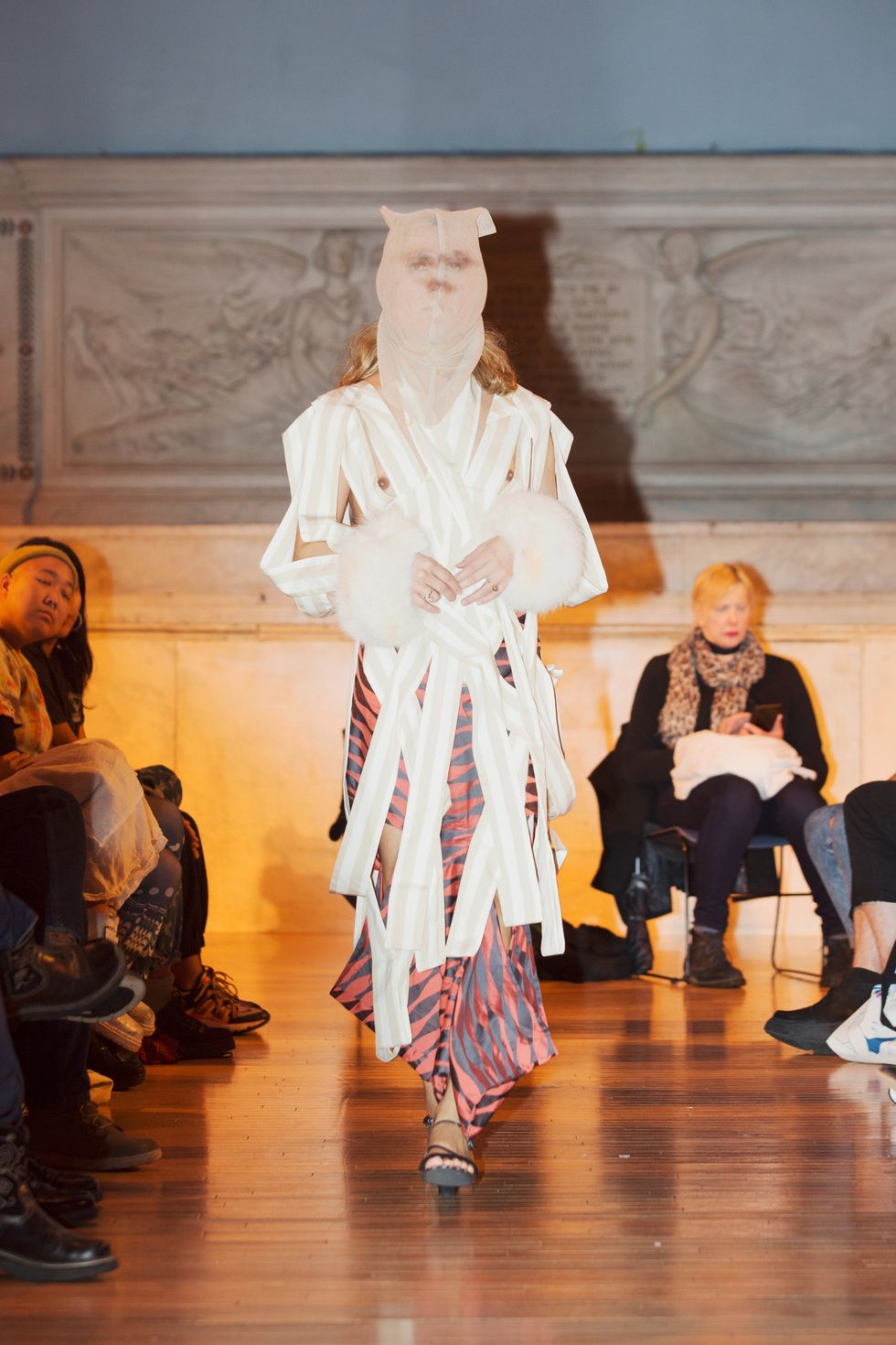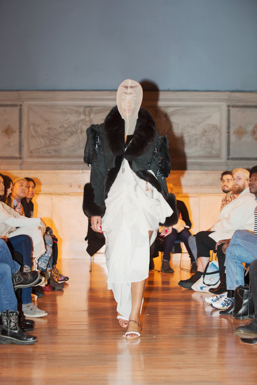 Graham is an insurgent in fashion in nearly every regard: Her collections are 100% upcycled, which both makes running an indie brand affordable, and marks a rejection of exploitative labor standards, and wasteful environmental practices that continue to fuel fashion, despite mounting scrutiny. Amidst New York's obscenely corporate landscape, Graham is completely independent, self-funding her show and fundraising cash to pay her models by selling original T-shirts on Depop.