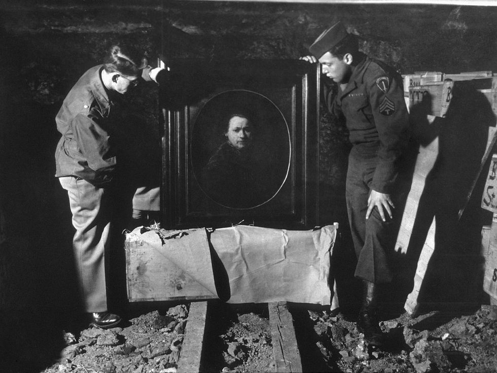 A U.S. soldier inspects priceless art taken from Jews by the Nazis during WWII. Photo taken in May, 1945 in Germany. (Photo via Getty)
