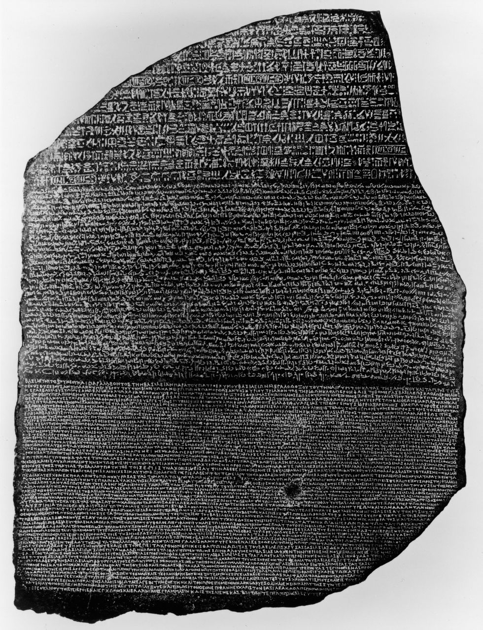 A photograph dating to the 1800s of the Rosetta Stone, first discovered in Egypt. The piece is housed in the British Museum.