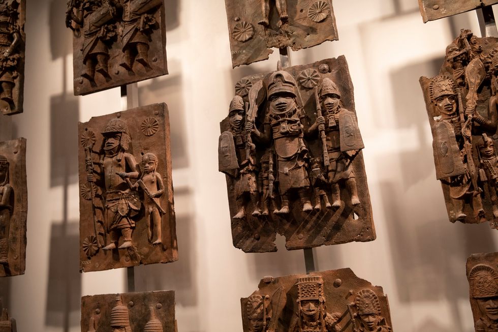 Portions of the Benin Bronzes on display in the British Museum, originally taken from what is now Nigeria by British troops in 1897. The institution is returning them to Nigeria. (Photo via Getty)