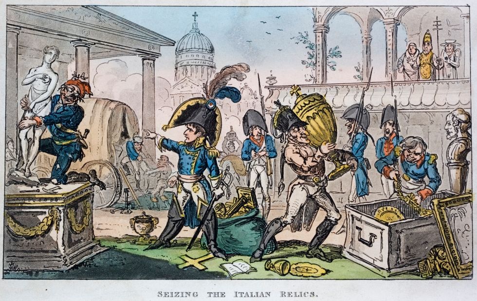 A British propaganda cartoon by artist George Cruikshank from 1815 depicting Napoleon and his army stealing Italian relics. (Photo via Getty)