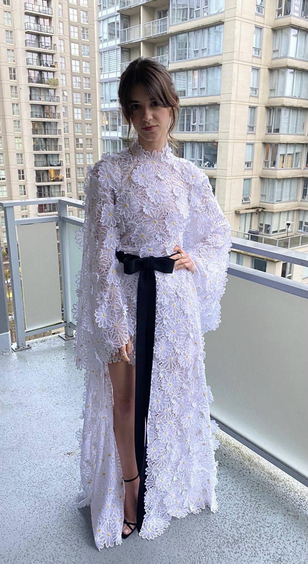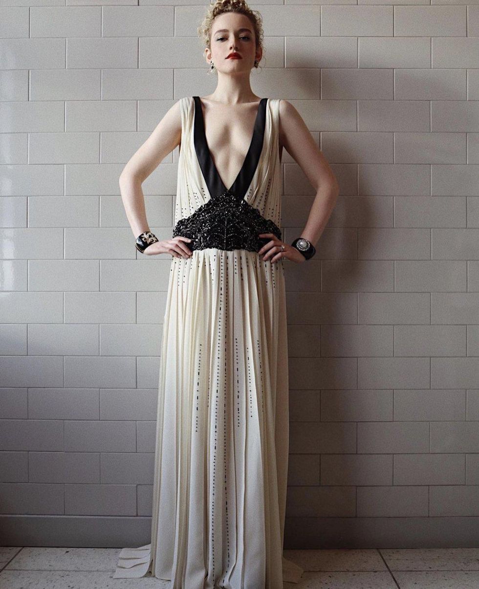 Rosamund Pike in a Molly Goddard Dress and Alexander McQueen Boots