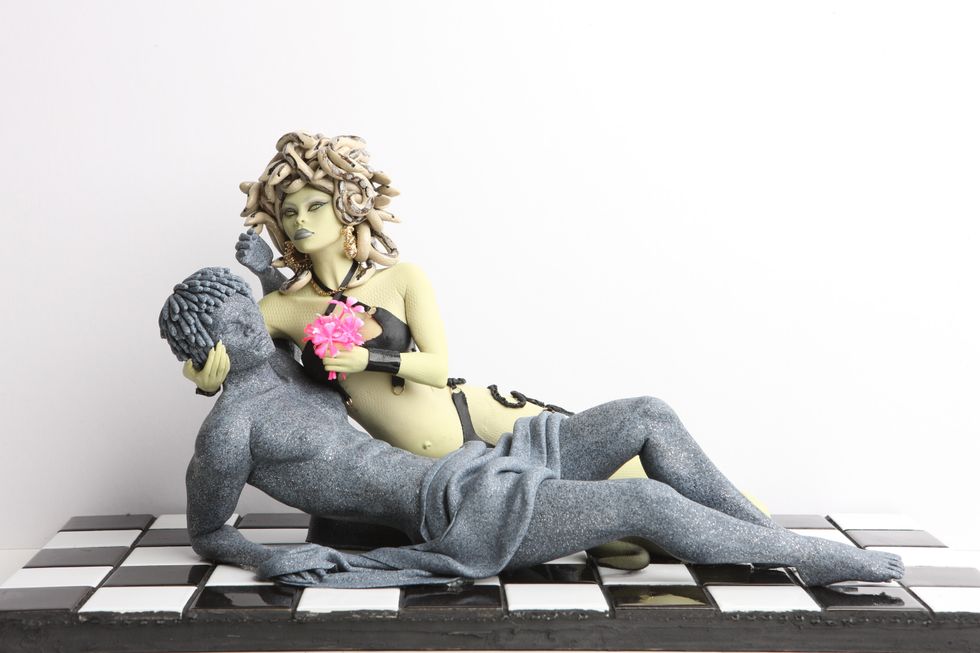 Fast forward to now (24 years old) and reading the book, I was horrified. I wanted this to be a take on what would happen to Patrick Bateman had the Furies of Ancient Greek mythology (mixed with old Blaxploitation movies from the '70s) had him get his comeuppance. I loved the way the movie was styled and so those aspects had to be incorporated into the piece. Also, the idea of the beheading stems from the mythology of Medusa. I wanted the female characters of this piece to take away his power. He is the only truly naked sculpture of this exhibition, the rest I consider to be nude.