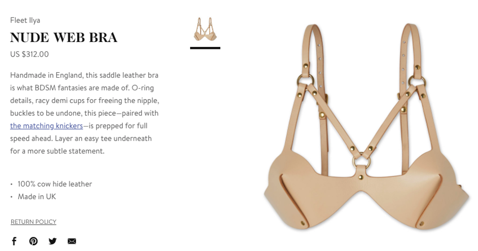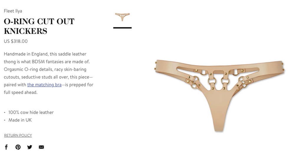For sale on Goop.com are a "studded handle flogger" ($250), a "racy," buckle-adorned demi cup "web bra" ($312), and matching "o-ring cut out knickers" ($318). The lingerie comes only in a tasteful nude, and it's all handcrafted from English saddle leather.
