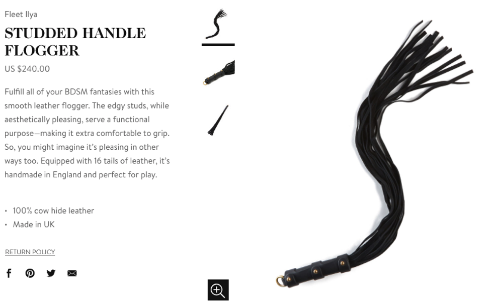 You see, the aspirational Goop Woman is expensive, well, aligned, perfumed, fit, exfoliated and perfect-looking, but also in-touch, progressive and culturally relevant (this is the company of a woman who "consciously uncoupled" with her ex-husband). Sex positivity is hip. Thus, Goop women do anal. Now, Goop ladies are now into being choked and spanked and BDSM is a part of their wellness praxis. Or at least, they're into owning bondage gear in order to subtly signal their superior sexual empowerment to their less hip friends. (Let's be honest, most of this inventory of floggers will probably be given as gifts at bachelorette parties in Hawaii).