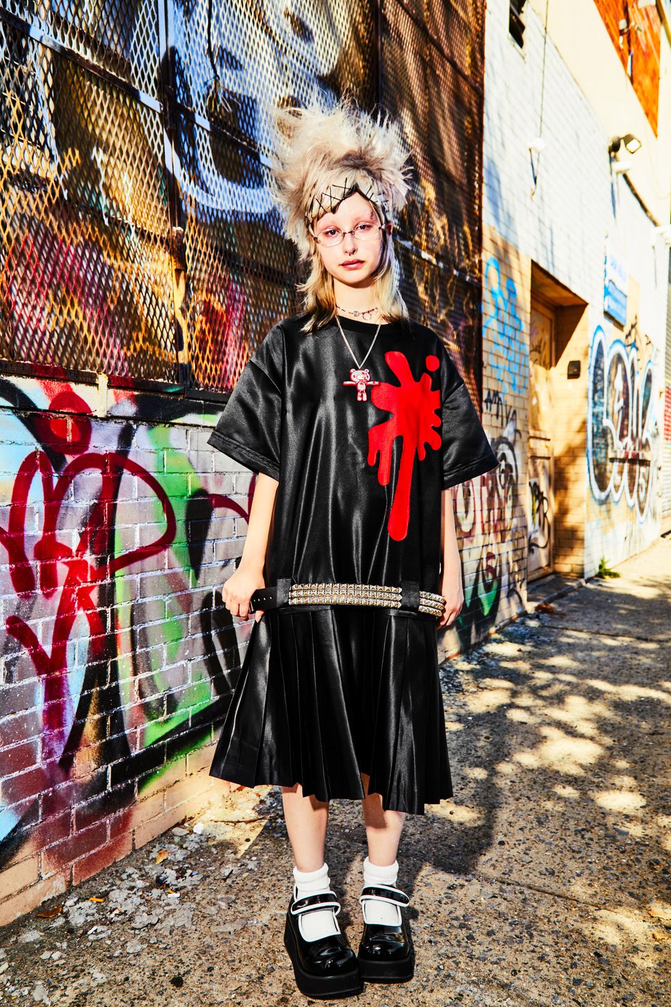 Featuring Gloomy's signature pink colors and blood splatter motifs, the collection is an ode to early alternative and punk movements in America. The lookbook consist of models that represent a wide spectrum of contemporary punk movements, including several former scene kids, in order to jumpstart the "scenecore" look. Graham calls it a "modern nostalgic take on the obsessive resurgence of the Y2K scene era."