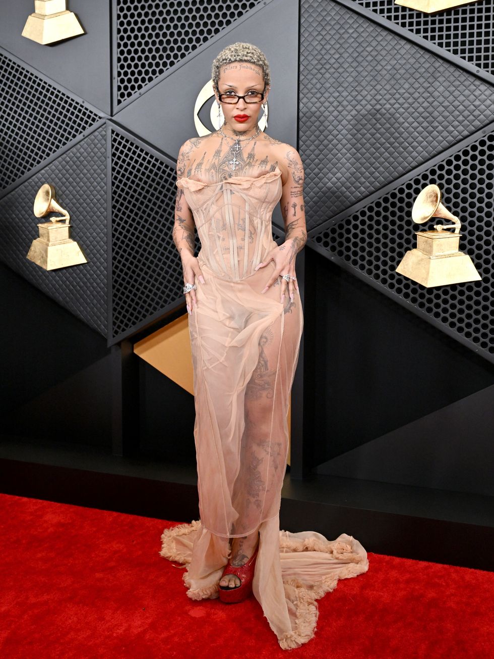 As others have mentioned on Twitter and beyond, Doja Cat’s Dilara Findikoglu ensemble was almost a direct ripoff of model Fashion LaBeija, AKA @tightcorsetloosemorals. Beyond any overt comparison though, the look just doesn’t come together in the slightest. Sorry, Dilara! To fake tattoo the designer on the forehead is a funny idea though. If only her sense of humor was actually funny these days.