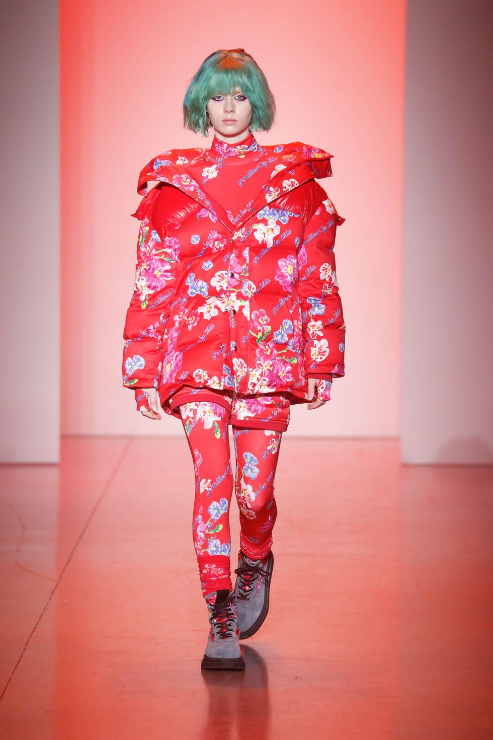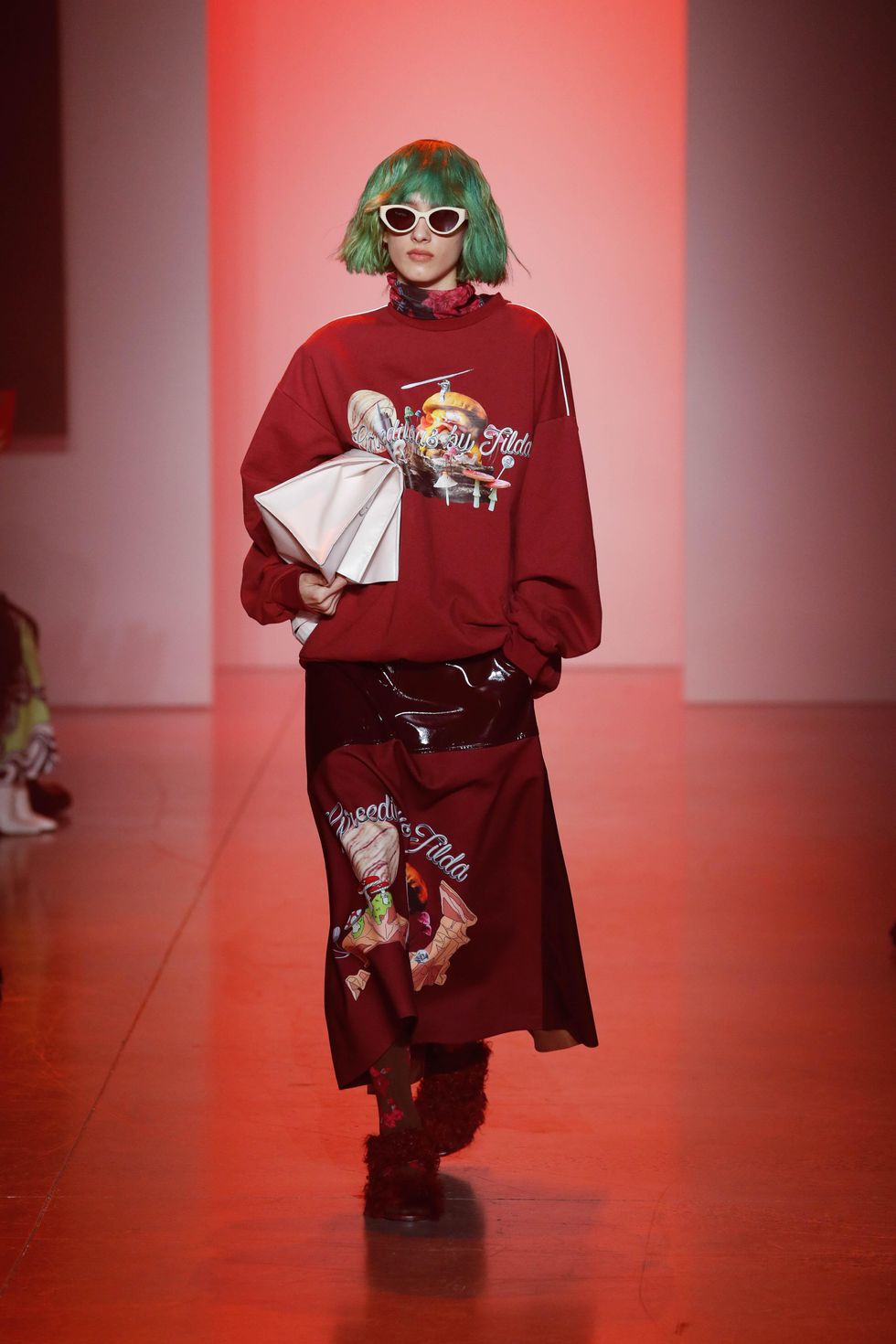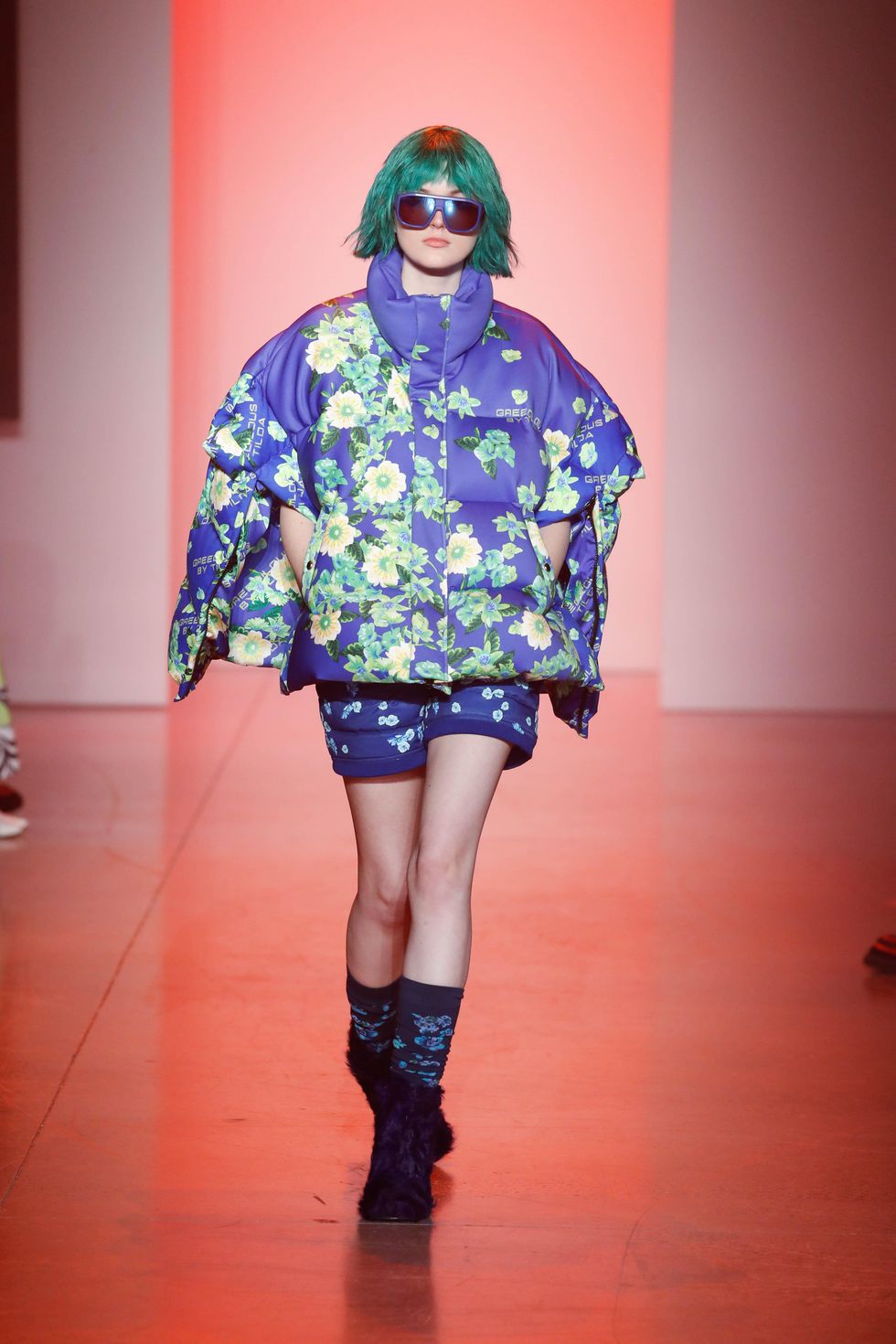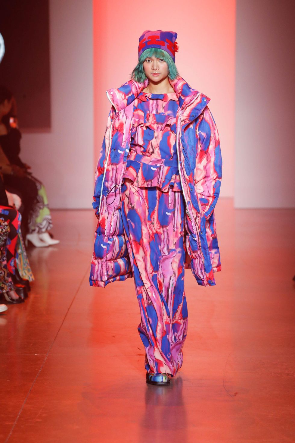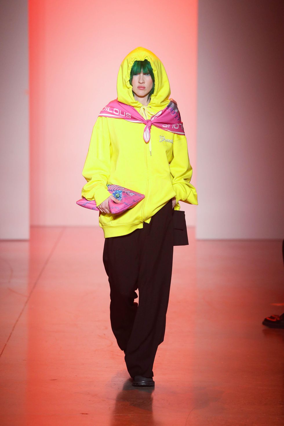 The theme at the heart of Greedilous by Tilda's runway show was humanity and its future. The models all sported wigs that mimicked Tilda's hair, and the garments were all colorful and bold. But while there were a lot of strong and vibrant visual elements, Park made sure to accent the looks with delicate details that added a soft and elegant touch.