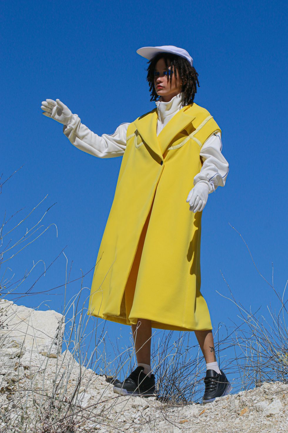The result of that quick thinking is a series of images nodding to vintage elements and country club sportswear. One model in a matching plaid windbreaker and trouser lies down on a rocky hillside. Another mimics walking atop red canyons in a yellow sleeveless jacket and ribbed sweater. A third strikes poses against grassy fields, wearing wide-legged pants and hybrid garment combining an oversized shirt and sweater. It fully merges nature and the artificial, a theme that's quickly become a brand signature.