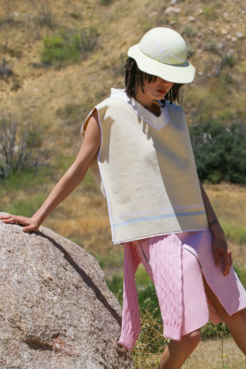 "As I held a cable knit sweater from the '50s in my hands, while standing in the heart of Hollywood, I felt like I was holding a piece of American fashion history," Gronkjaer recalls to PAPER. "I wanted to incorporate the history of the knit in a newly imagined piece, by fusing it with a completely different construction — a button down, a skirt, a vest. Working with both upcycling and deconstruction, I played with fusing old and new elements together to create a new story."