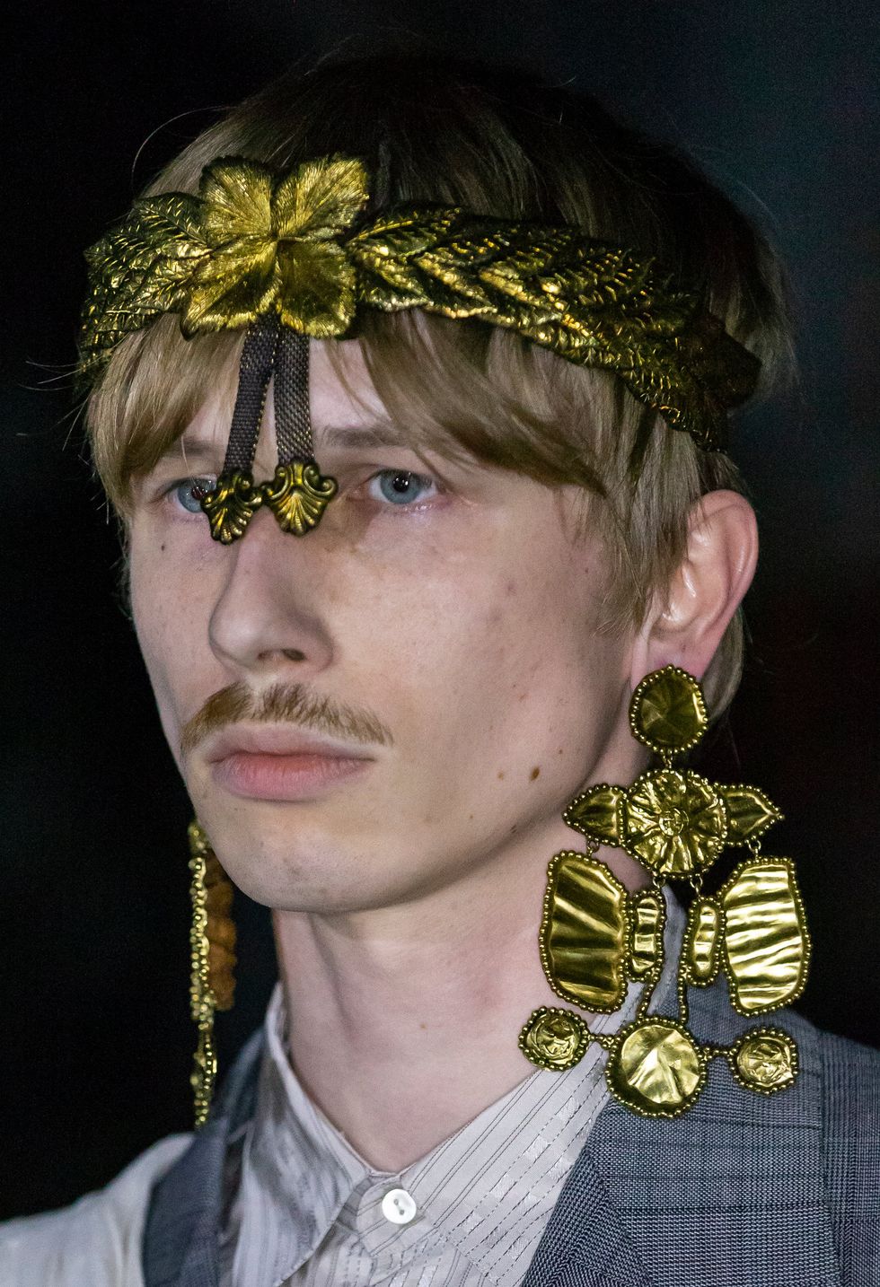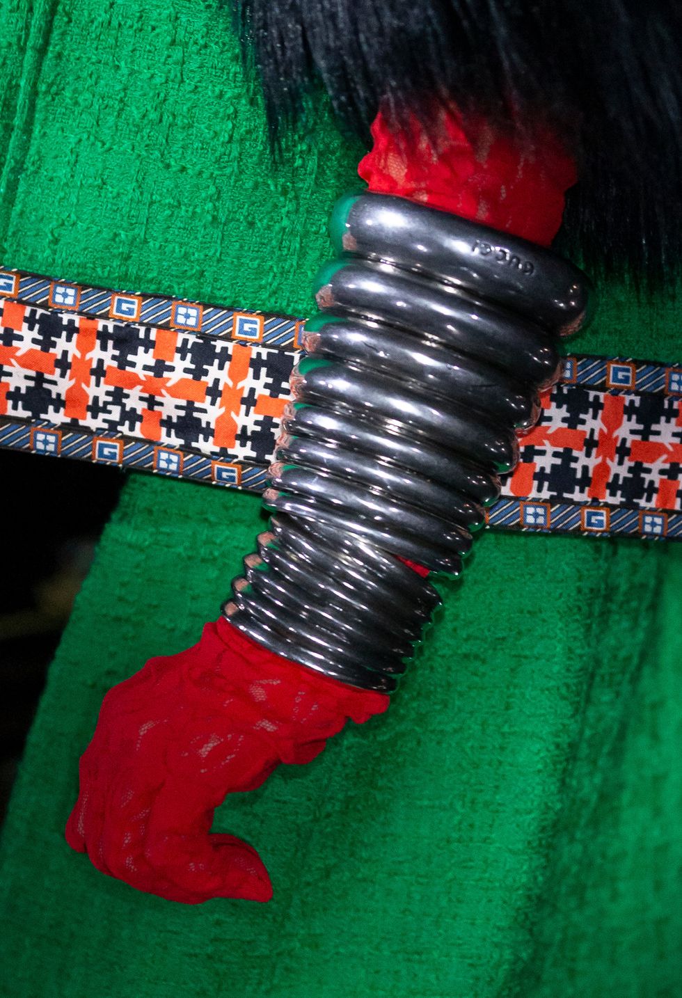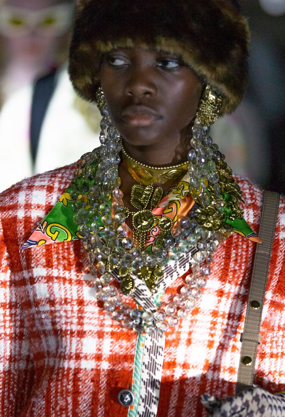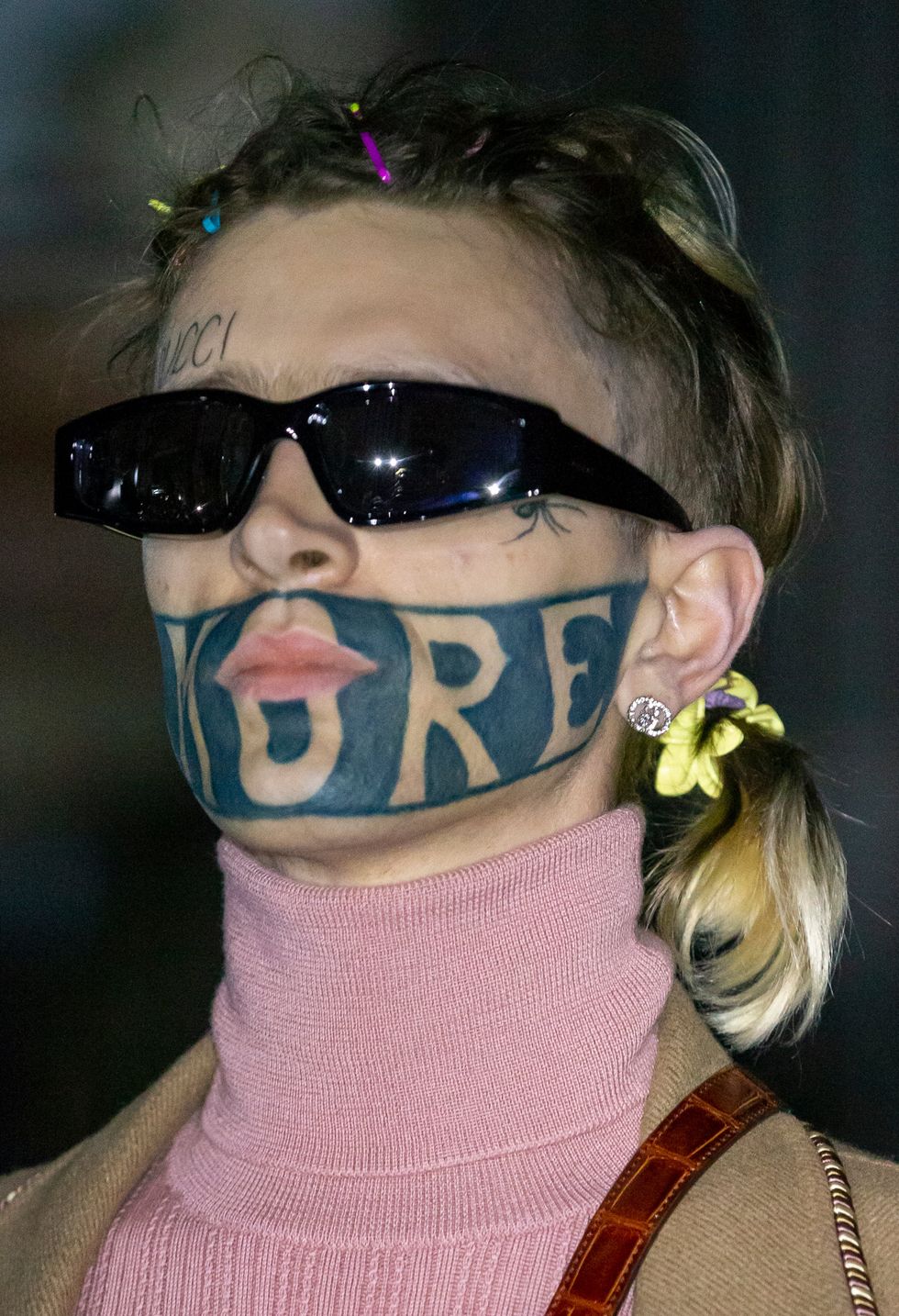 Alessandro Michele is clearly paying attention to horrific anti-abortion legislation currently sweeping through multiple US states. The collection featured a lovely silk empire waist gown with an elaborately embroidered uterus on the front, plus the phrase "My Body, My Choice" stitched to the back of a royal blue blazer — a feminist slogan from the 1970s. Retrograde anti-abortion policies call for retrograde protest methods, right?