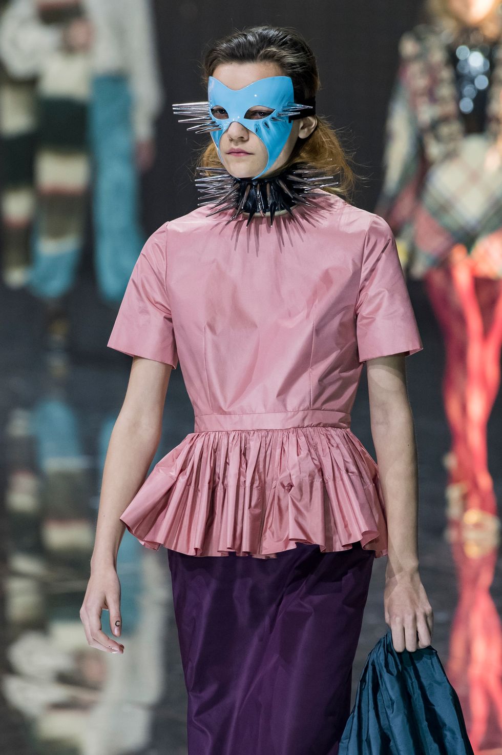 Following the theme of masks, Michele put actual masks on the models. Many of them recalled Venetian masks — some were black leather and covered in dangerous studs. Others were rendered in bizarrely flat shades of blue and green and styled with spiky dog collars. "If appearance represents the physiological conditions of our thinking of ourselves as persons in relation, masks can offer themselves as the means through which we can give citizenship rights to our manifold becoming," read the show notes.