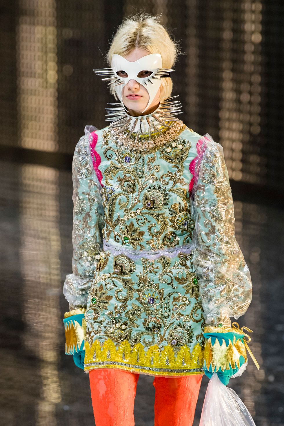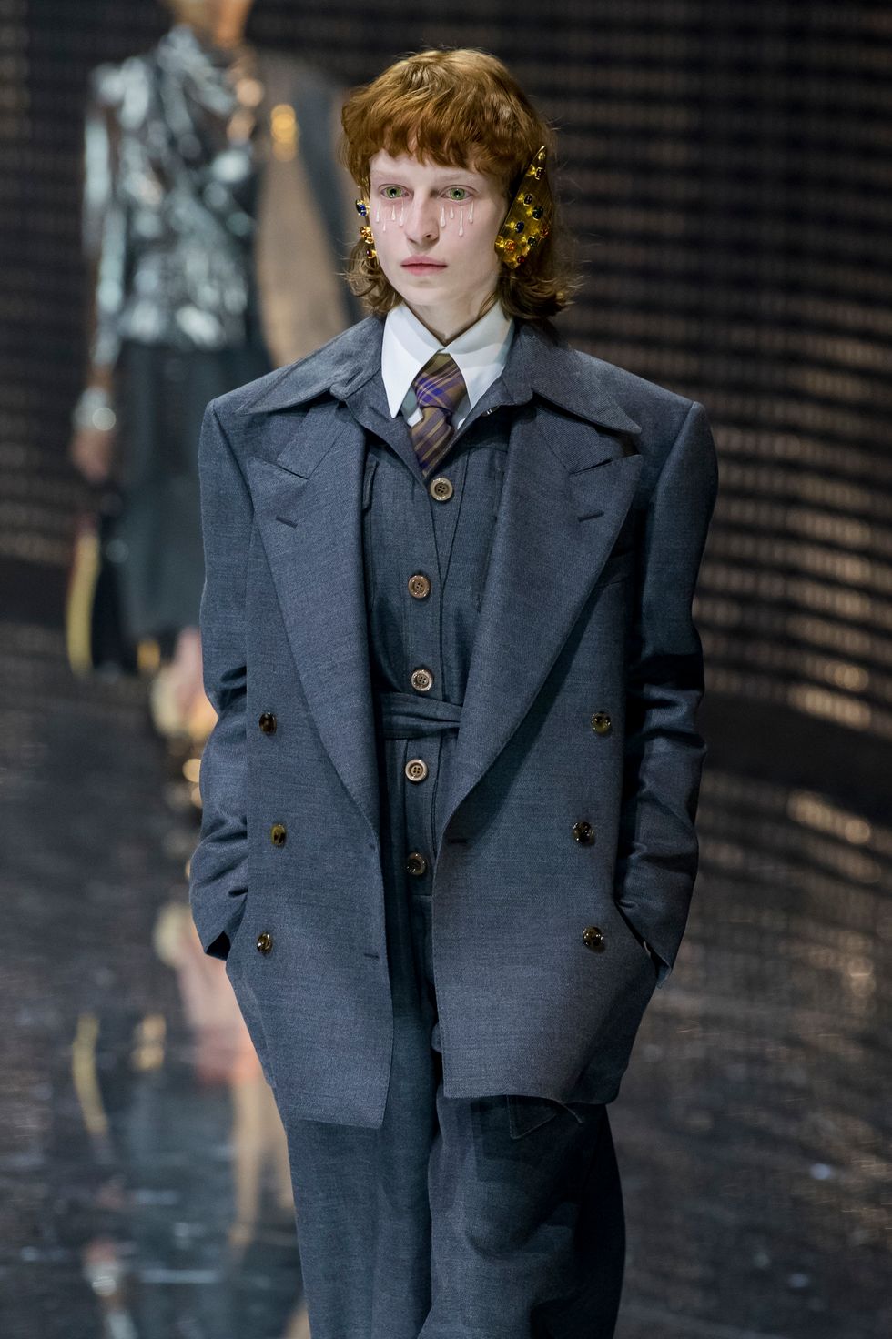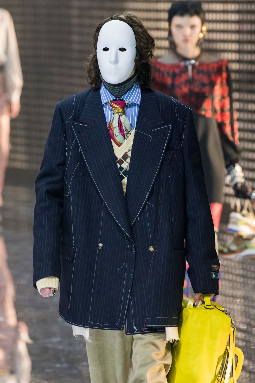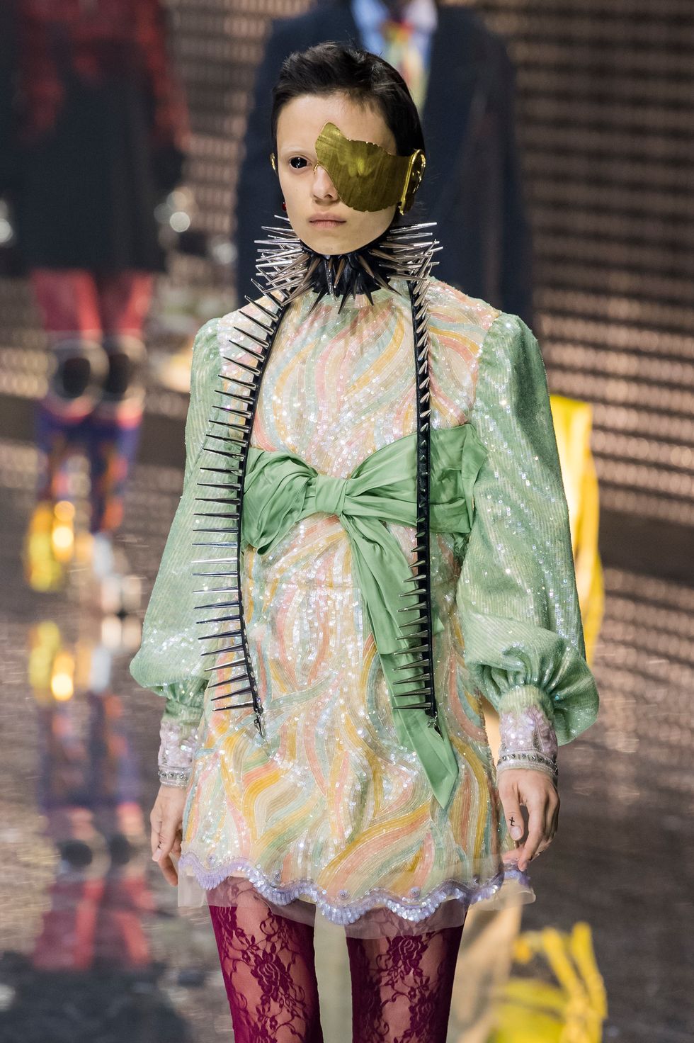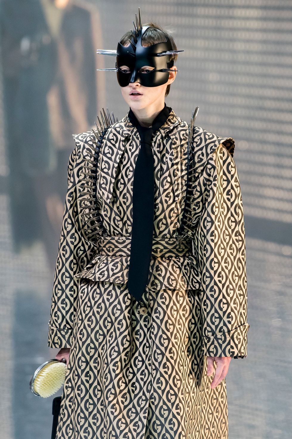 Before guests even got to the venue for the fall 2019 Gucci show, creative director Alessandro Michele had sent them a sneak peek of the collection theme. The invite, sent in a big box, was a white mask. The collection show notes were aptly titled "The mask as a cut between visible and invisible," and the set — comprised of 120,000 flashing LED bulbs — served as a sort of self-reflection of Michele's inner aesthetics and feelings. Simply put, it seemed to be a transformational moment for Gucci. This may not have been Michele's strongest Gucci collection to date, but it was interesting to see how Michele approached a more toned down sensibility. Here's everything you need to know about the fall 2019 show.