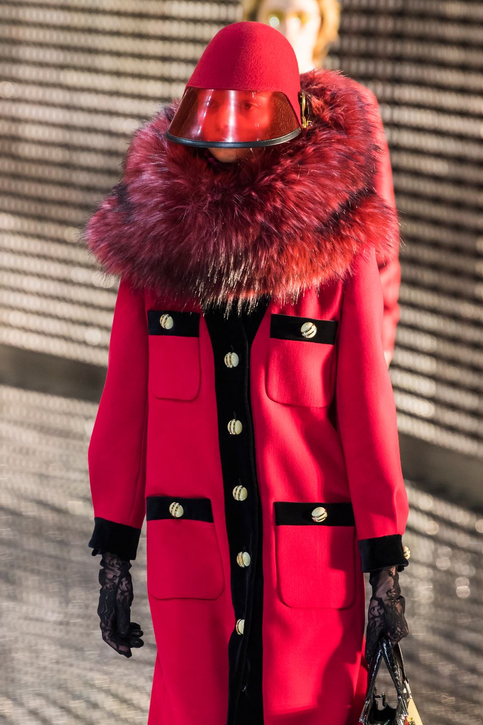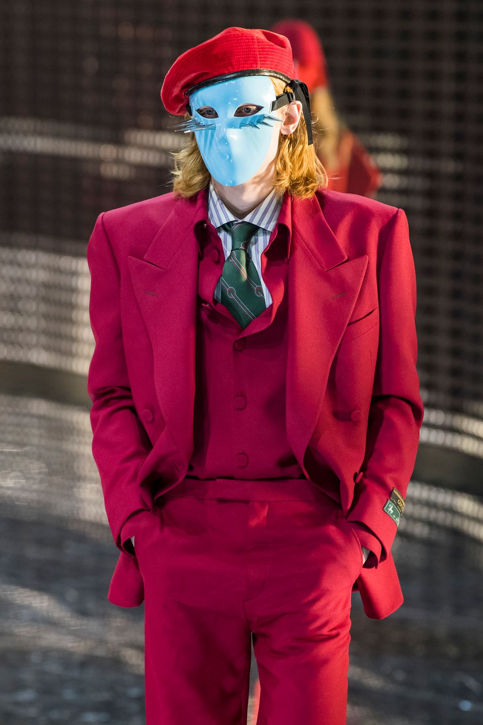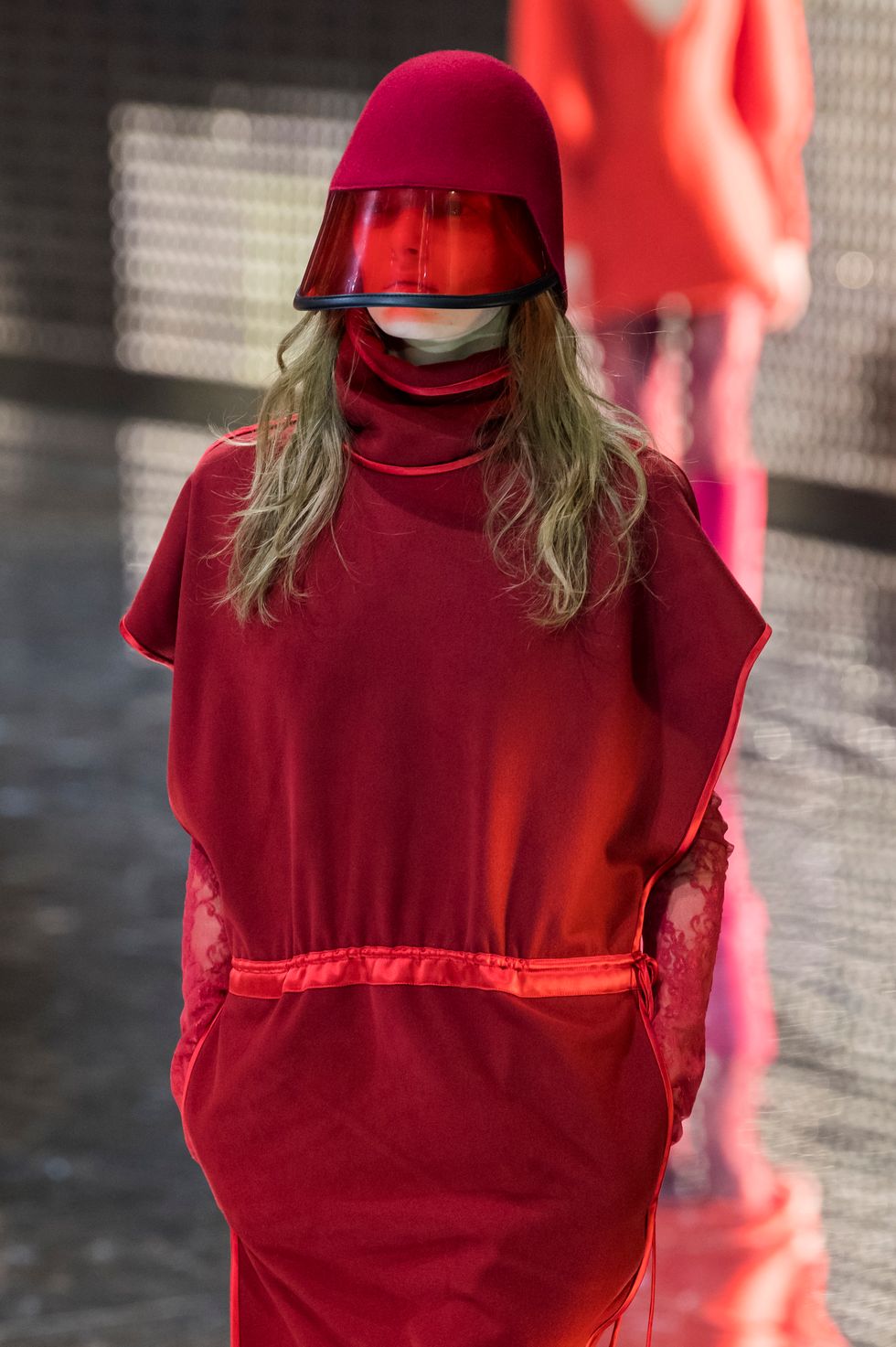 Aside from the toned down color palette, a slew of red looks took over midway through the collection. Some of them were even head-to-toe monochromatic, with matching masks. They were the most maximalist, magpie-centric thing about the collection.