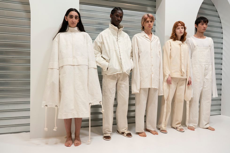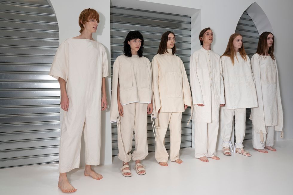 For Gucci's Spring 2020 show in Milan today, each seat contained lengthy philosophical show notes that referenced the work of social theorist Michel Foucault. Inside, they described the relationship between power, ideas, fashion, and society — concepts that manifested themselves in the first 60 looks of the collection, where models stood stoically as they glided on a conveyor belt in plain beige and ivory outfits. According to the brand, they represent the "uniforms, utilitarian clothes, the normative dictated by society and those who control it."