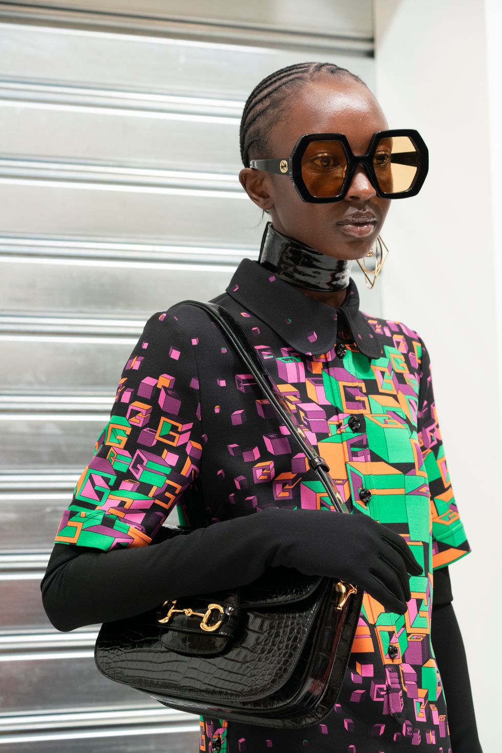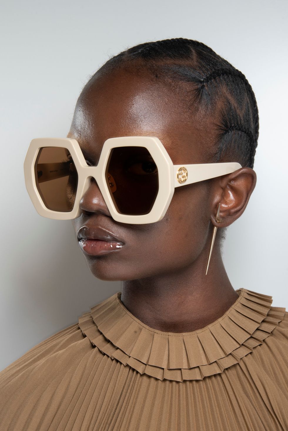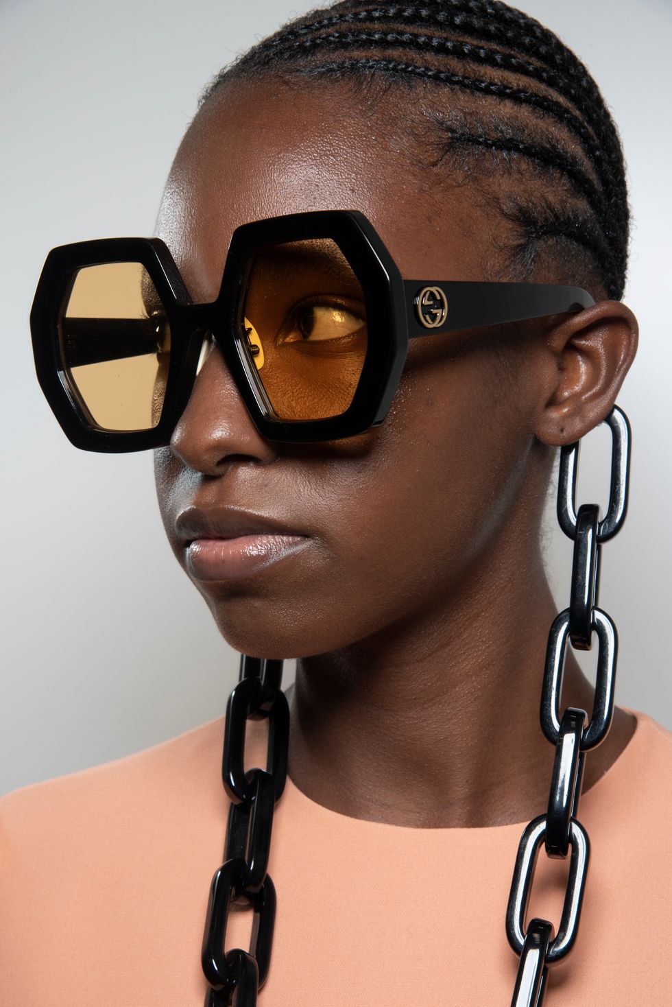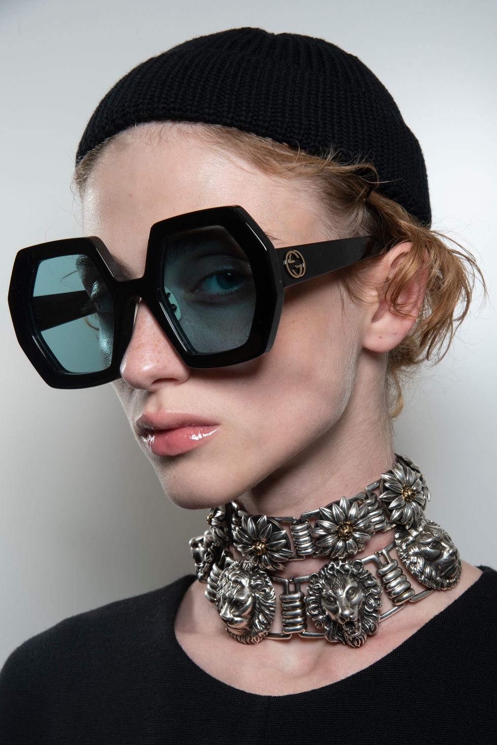 In keeping with the trend of moving away from tiny sunglasses this season, Gucci opted for giant oversized frames, including some pairs with attached chains.