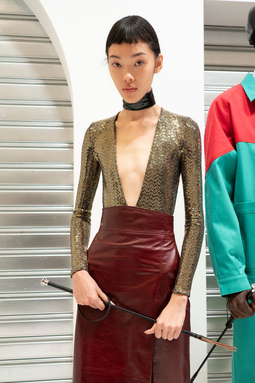 Perhaps the biggest surprise in this collection was the many sexy looks that nod to the brand's '90s heyday, including see-through lace skirts with thigh-high slits, deep plunging necklines, and S&M-style riding crops.