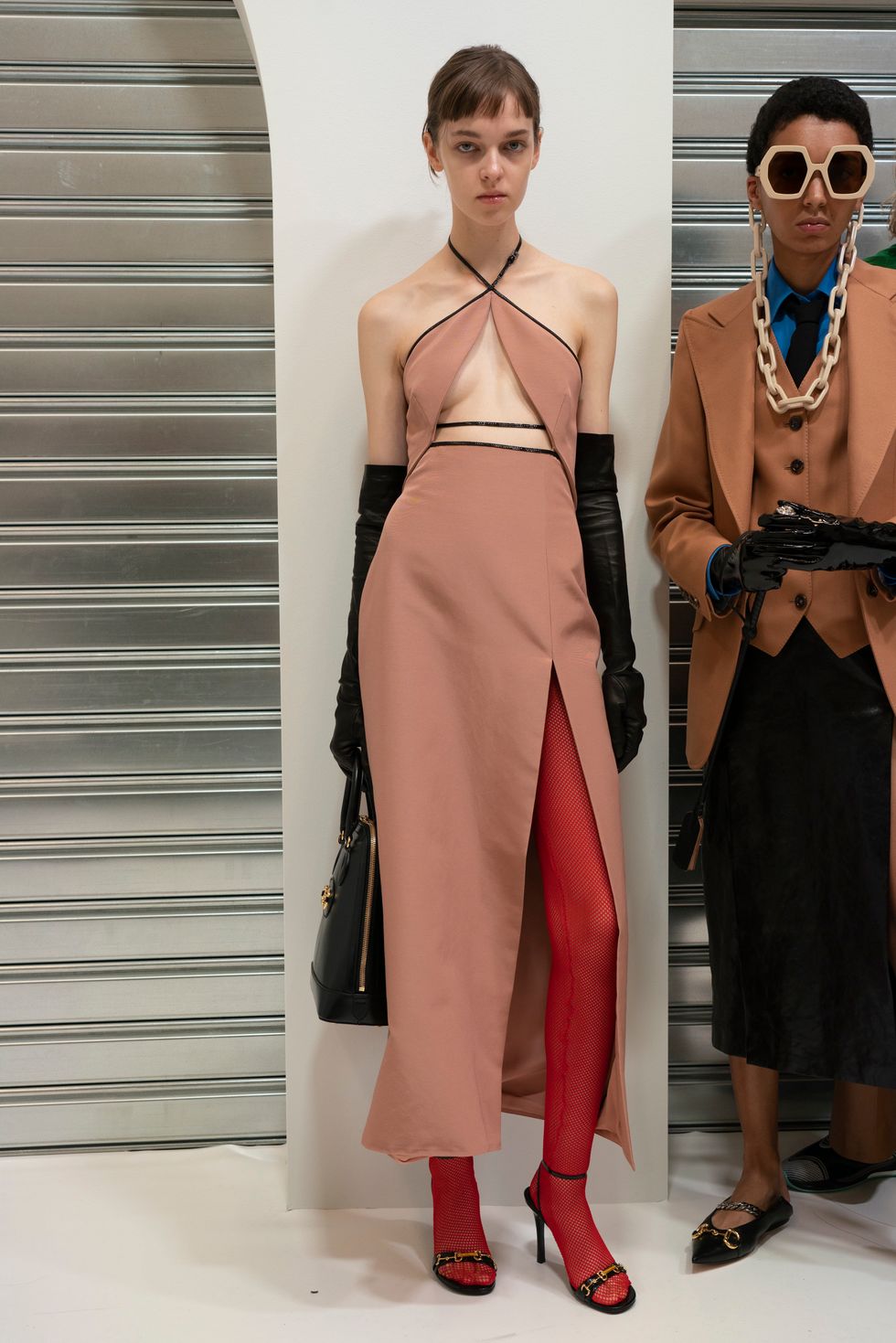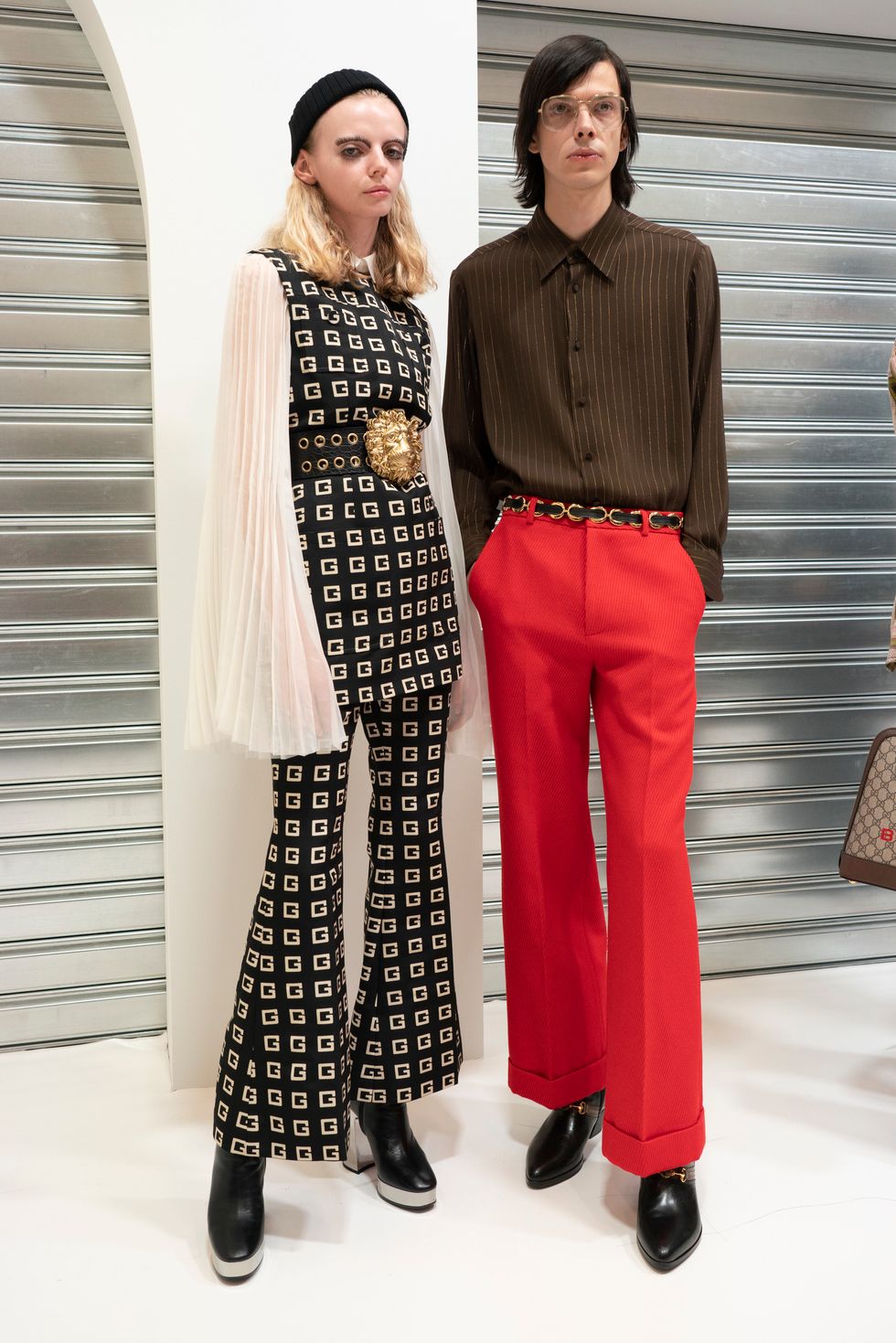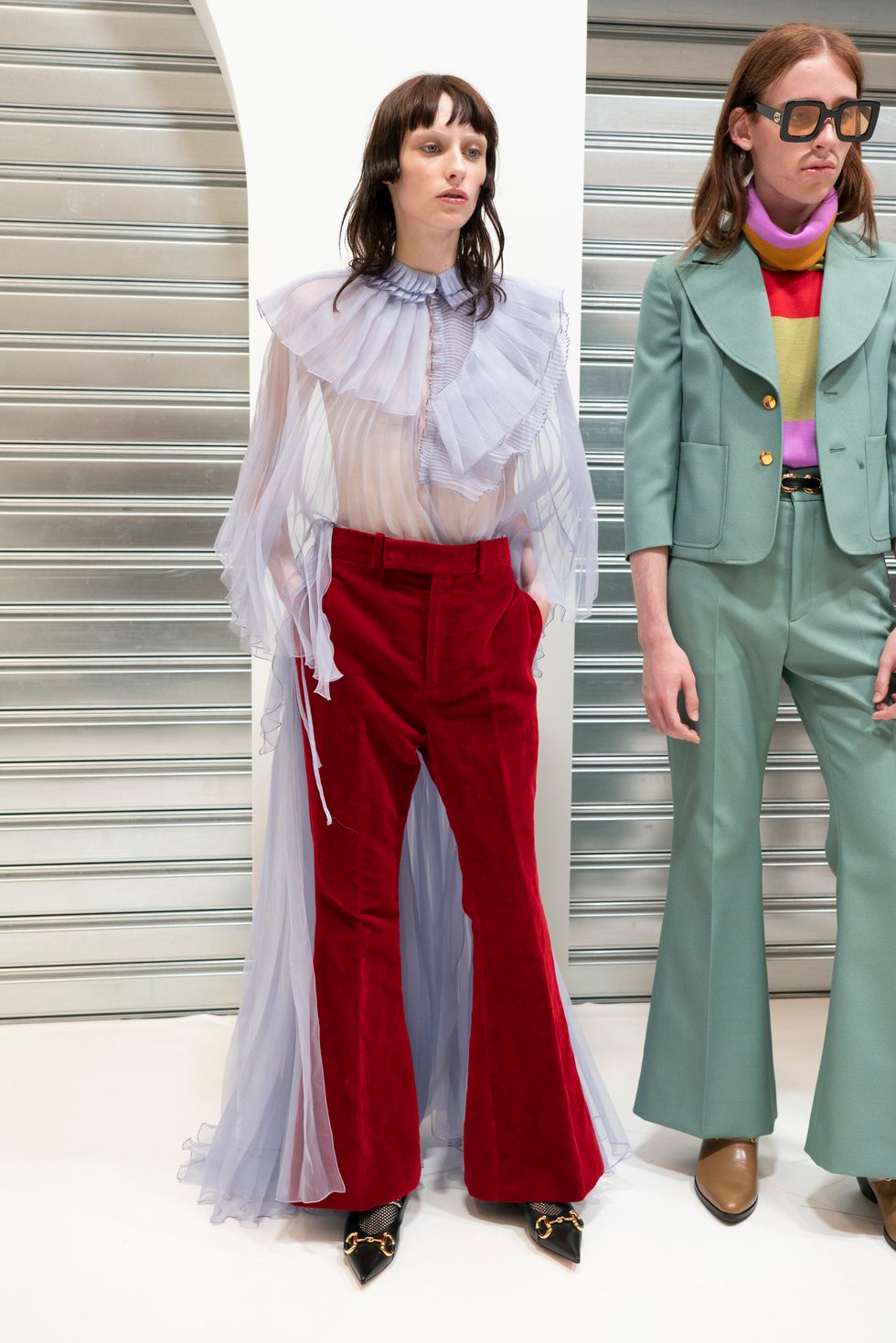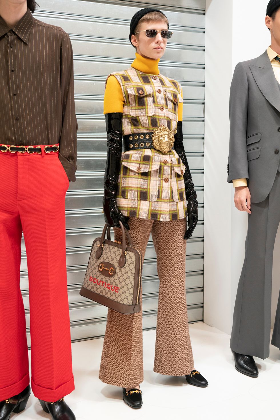 But afterwards, models emerged against the white, clinical set in the colorful getups and maximalist attire the brand is known for under Creative Director Alessandro Michele. The idea of liberation was heightened even further when models appeared in hints of sexy details that have not been addressed the past few seasons. (The word "Orgasmique" was displayed by the show's entrance as well as on a model's jacket.) It's just one of the many ideas Michele explored with gusto this season: Here's everything else you need to know about the collection.