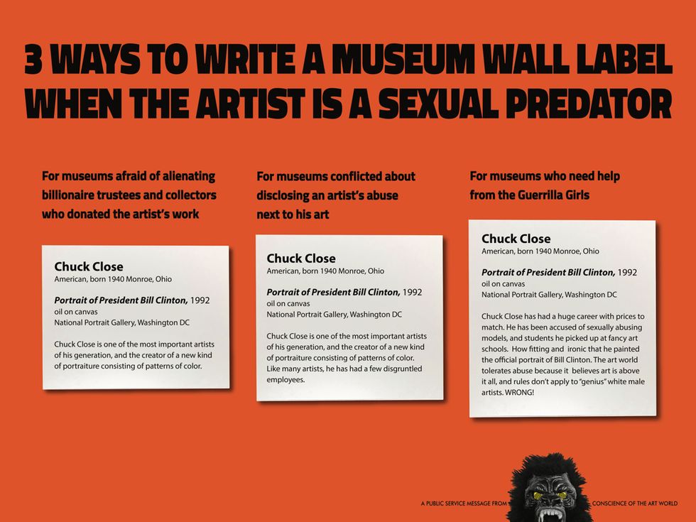The Guerrilla Girls believe that artists guilty of sexual misconduct should be held accountable, no matter how "genius" they are, and that viewers should have context for the art they see.