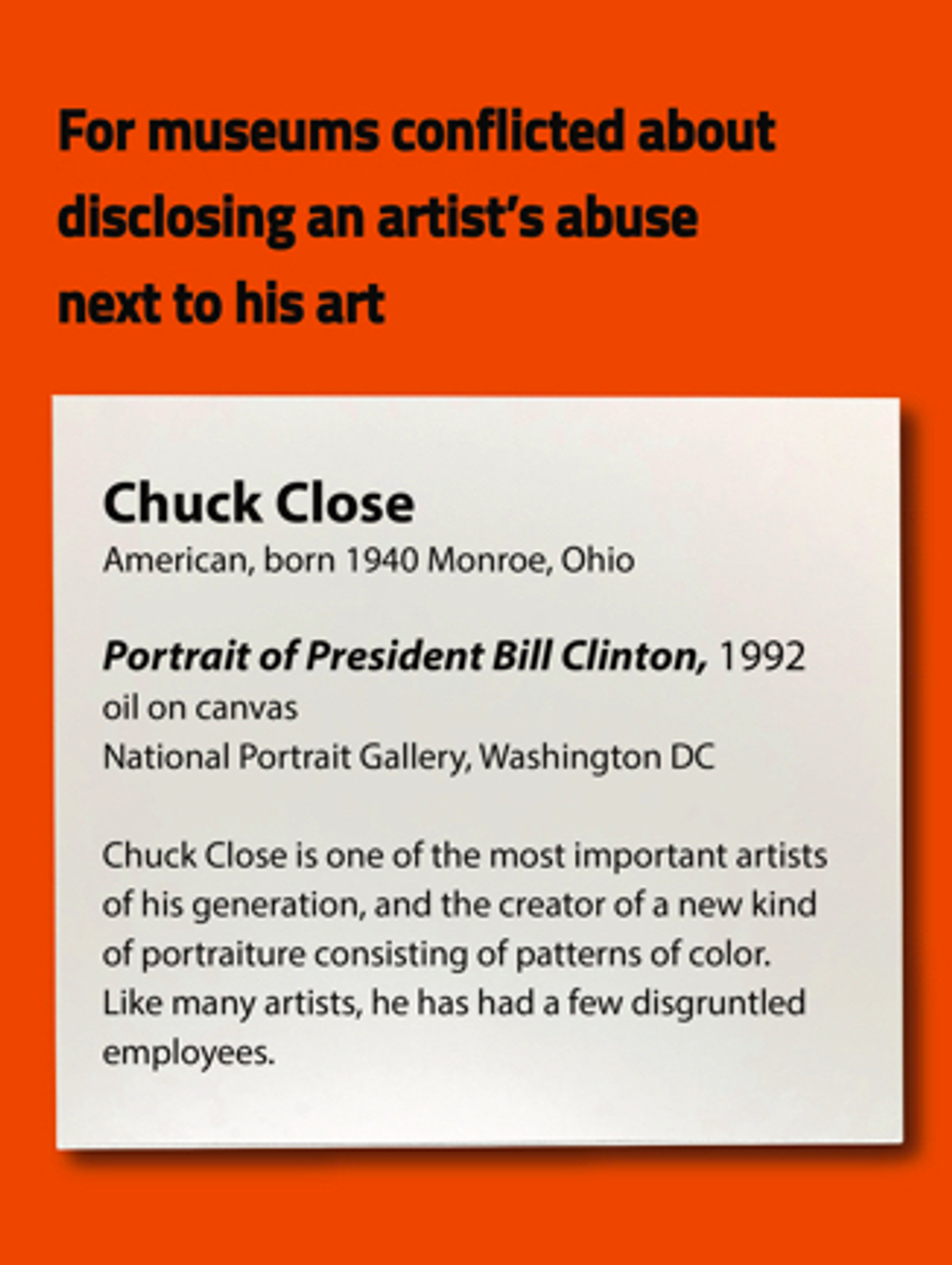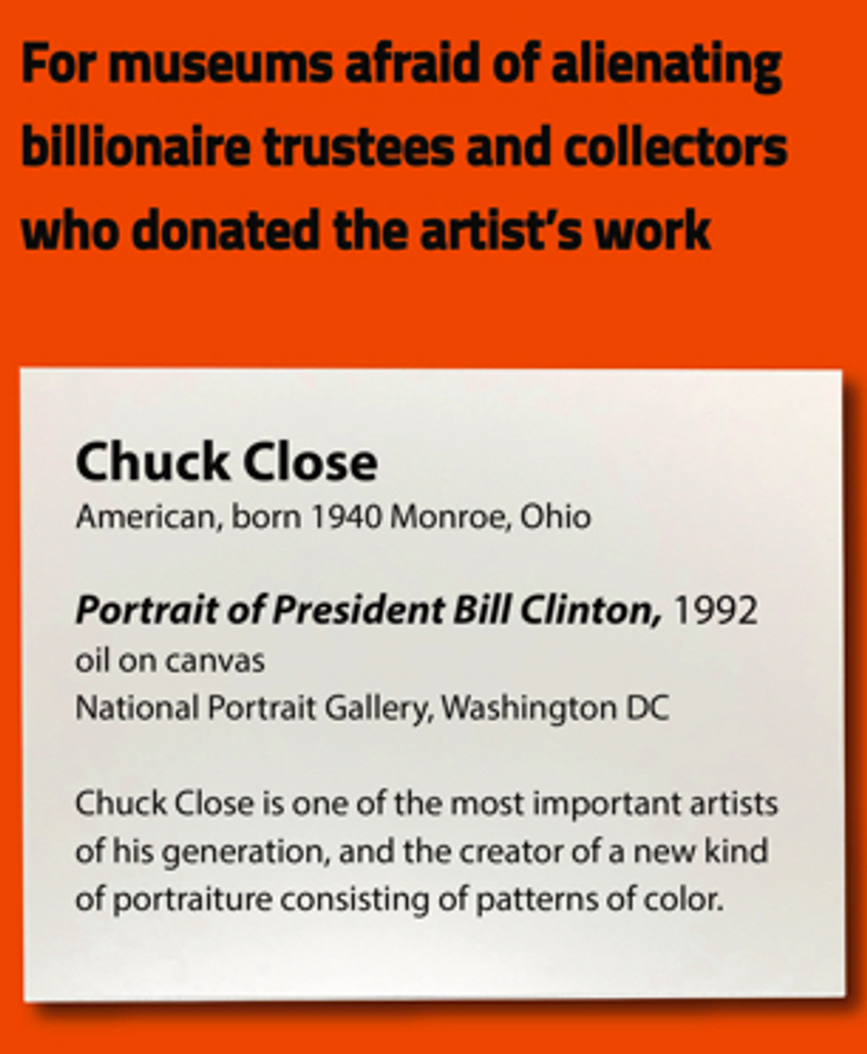 The labels were inspired by a 2006 portrait of Bill Clinton by Chuck Close. Close, the painter famous for his huge-scale portraits, was accused last year of sexually assaulting his models. He's since apologized, but has had several exhibitions of his work cancelled. Close is just one of the recent prominent members of the art world who have recently been accused of sexual misconduct, including collector Francois Odermatt, gallerist Anthony d'Offay, dealer Aaron Bondaroff and publisher of Artforum Knight Landesman.