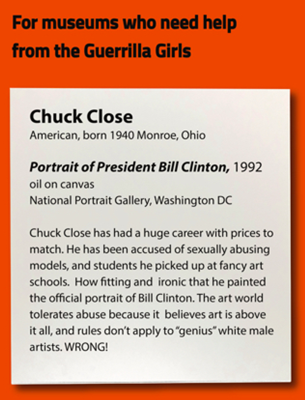 One member of the group most famous for a satirical list of "The Advantages of Being A Woman Artist," told artnet the Guerrilla Girls were inspired after seeing Close's portrait of Clinton in the National Portrait Gallery last winter: "One accused sexual predator painting another!"