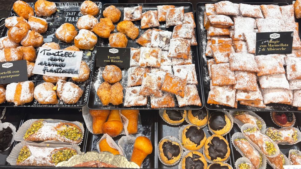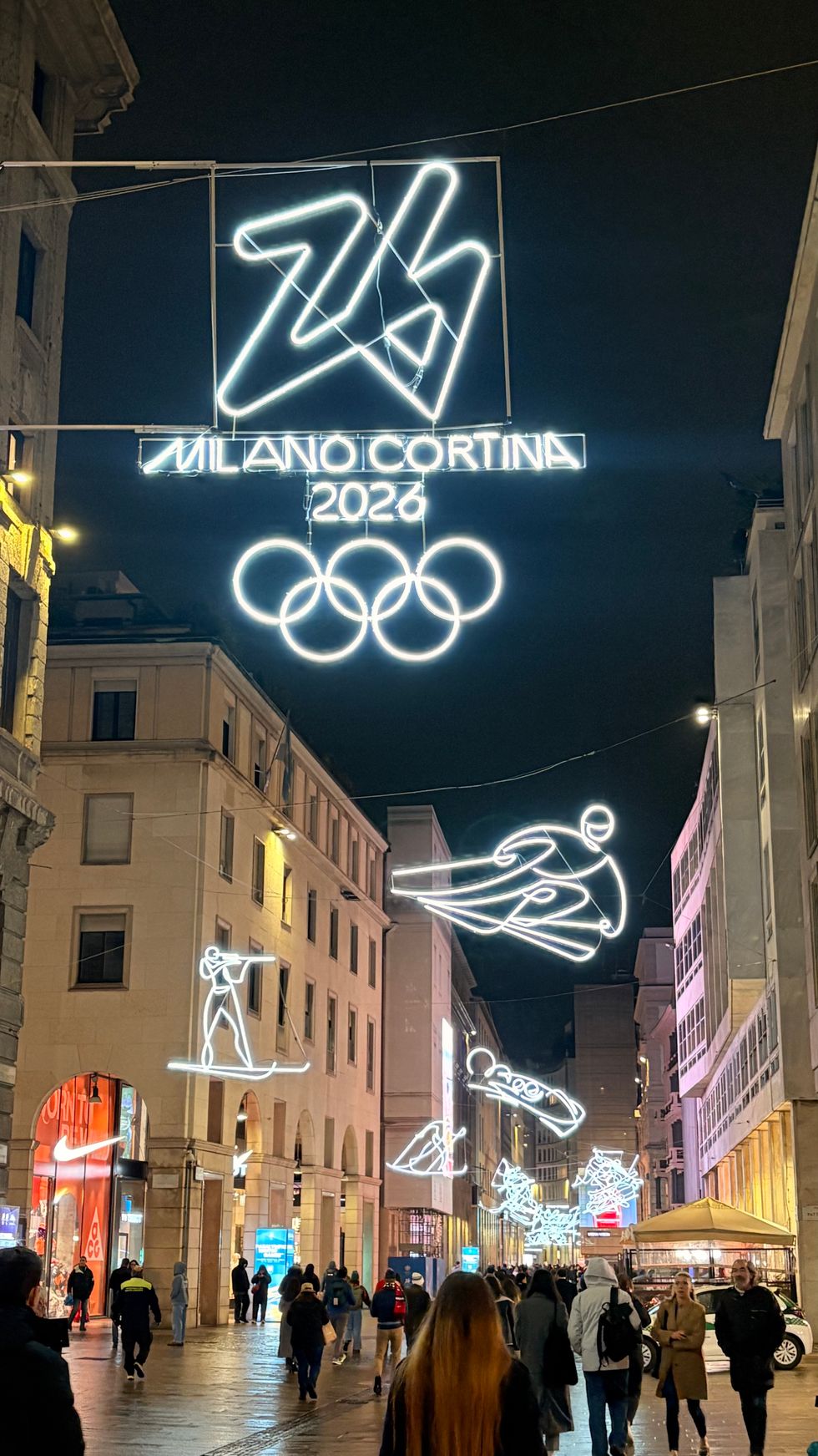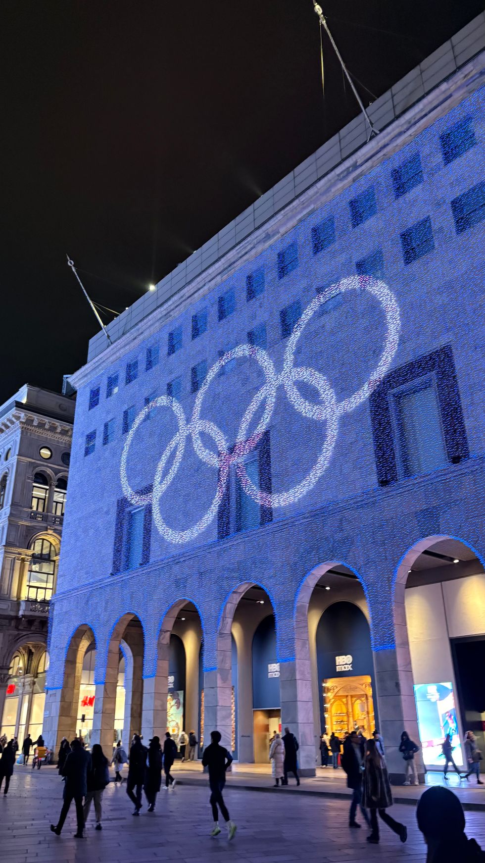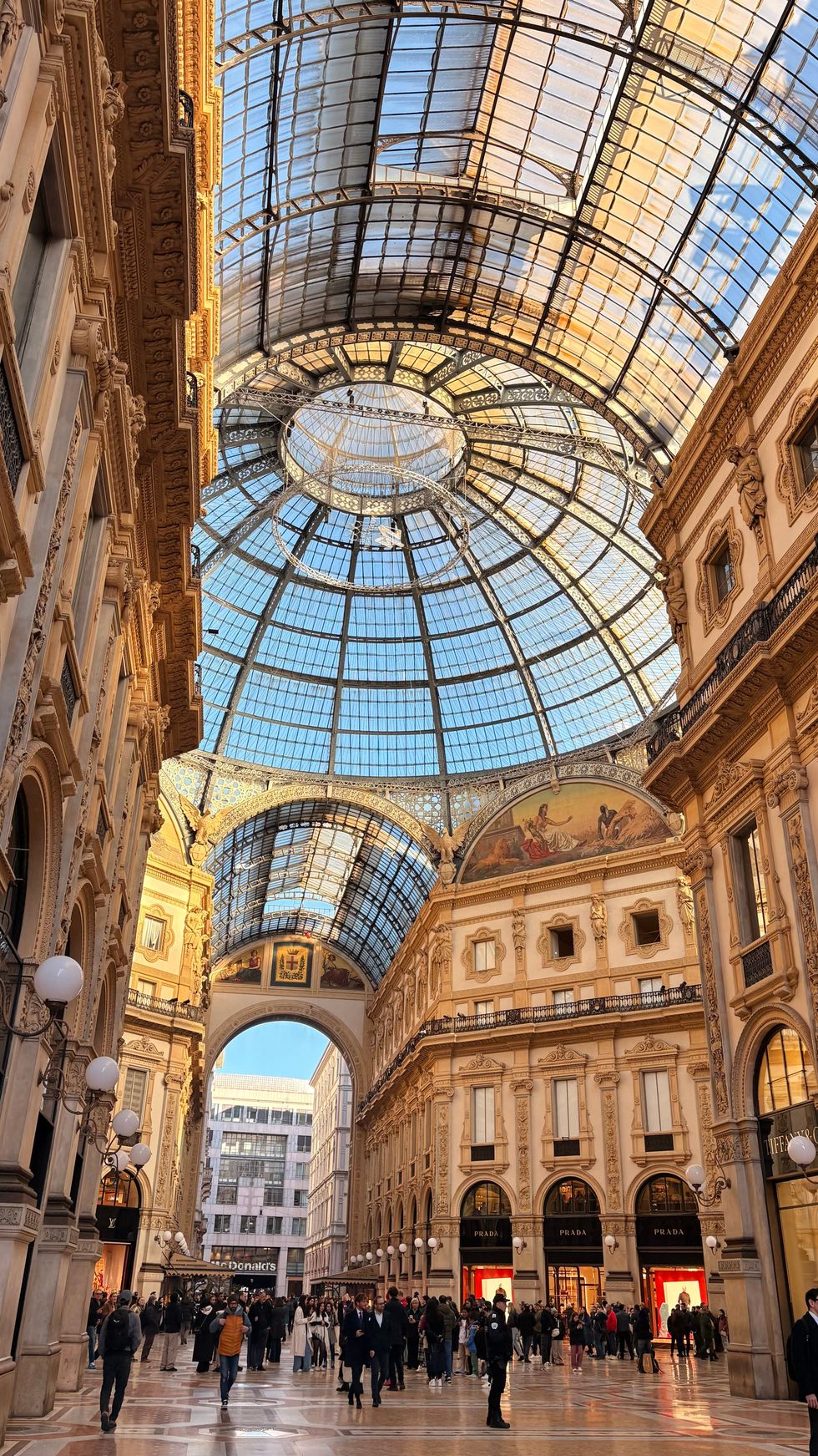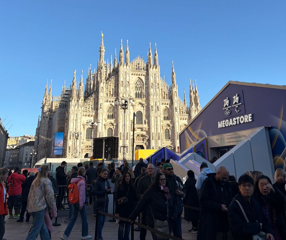 Once we leave the pop-up store, we pass a line of hundreds of people now waiting to get inside; they’re the first sign of life on the city streets. We walk with Kenworthy in front of the gargantuan Duomo and approach the equally spectacular Galleria Vittorio Emanuele II next door, a 1800-era arcade topped with a massive glass atrium. “And now, this is where Dua Lipa filmed her instantly-iconic NBC commercial,” Kenworthy, now a de-facto tour guide, cracks of the ad. Inside the Galleria, a few of us, including Kenworthy, take a good-luck spin around a mosaic of a bull's testicles on the floor; a Milanese tradition. (Honorary Italian George Clooney also took a twirl around it with wife Amal the day before.)