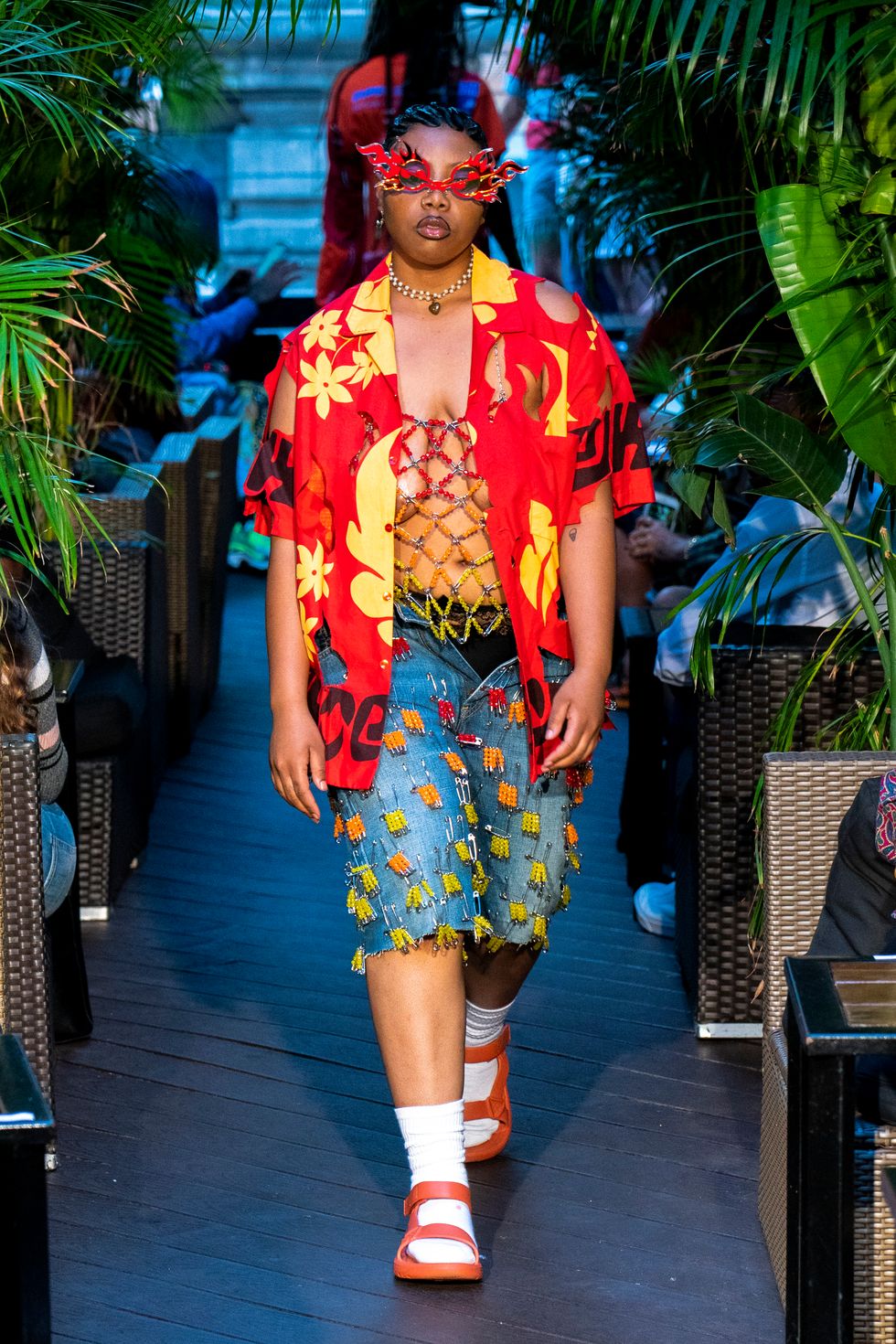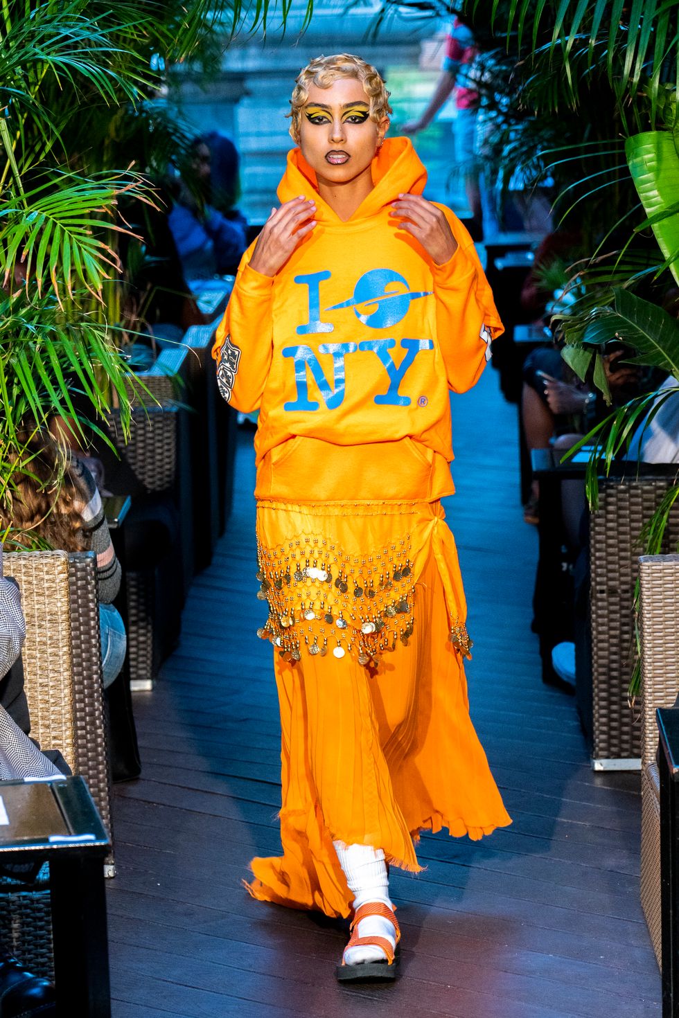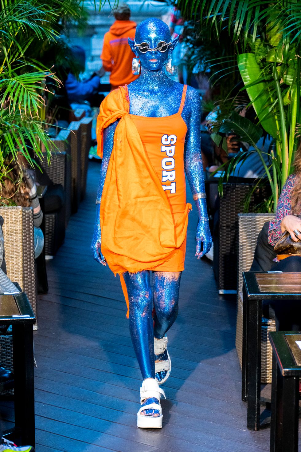 Models would complete their prowls to the futuristic funk instrumentals of Aaliyah and Missy Elliott tracks. Then, every so often, an alien-esque being would come forward, as if beamed down from Mars. Their skin was made entirely of shimmering glitter, and they were there to transport audience members into another realm, whether here on Earth or to the next dimension.