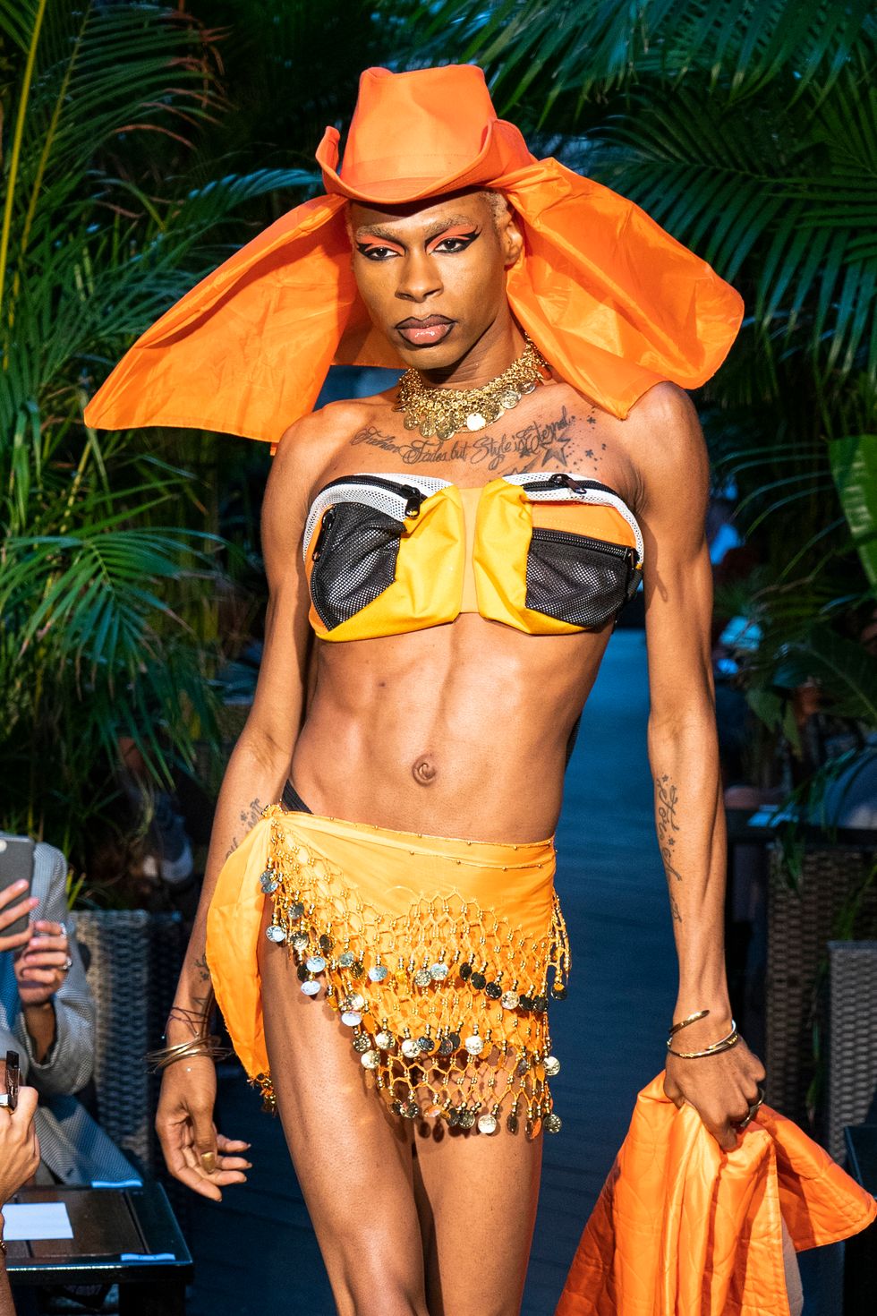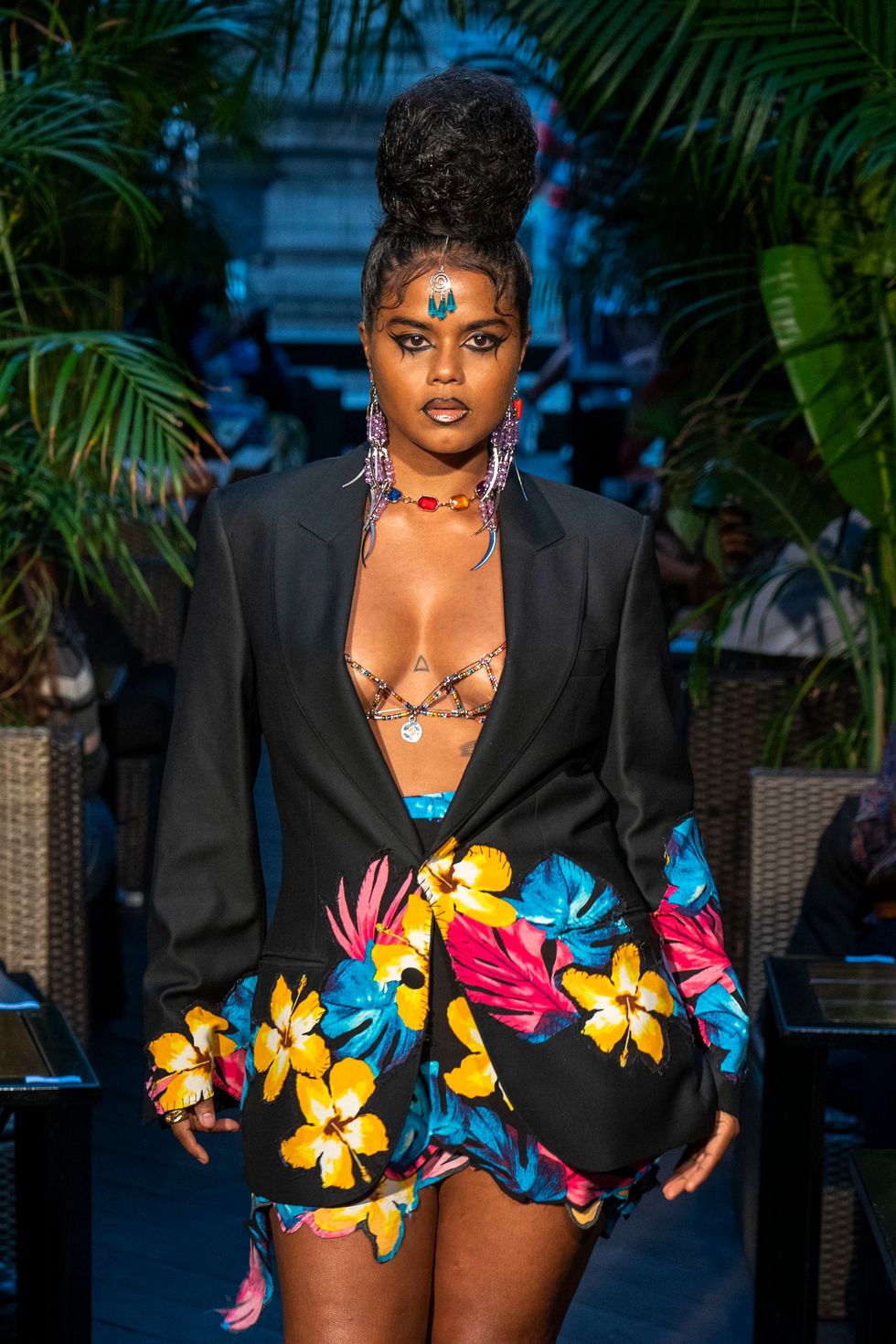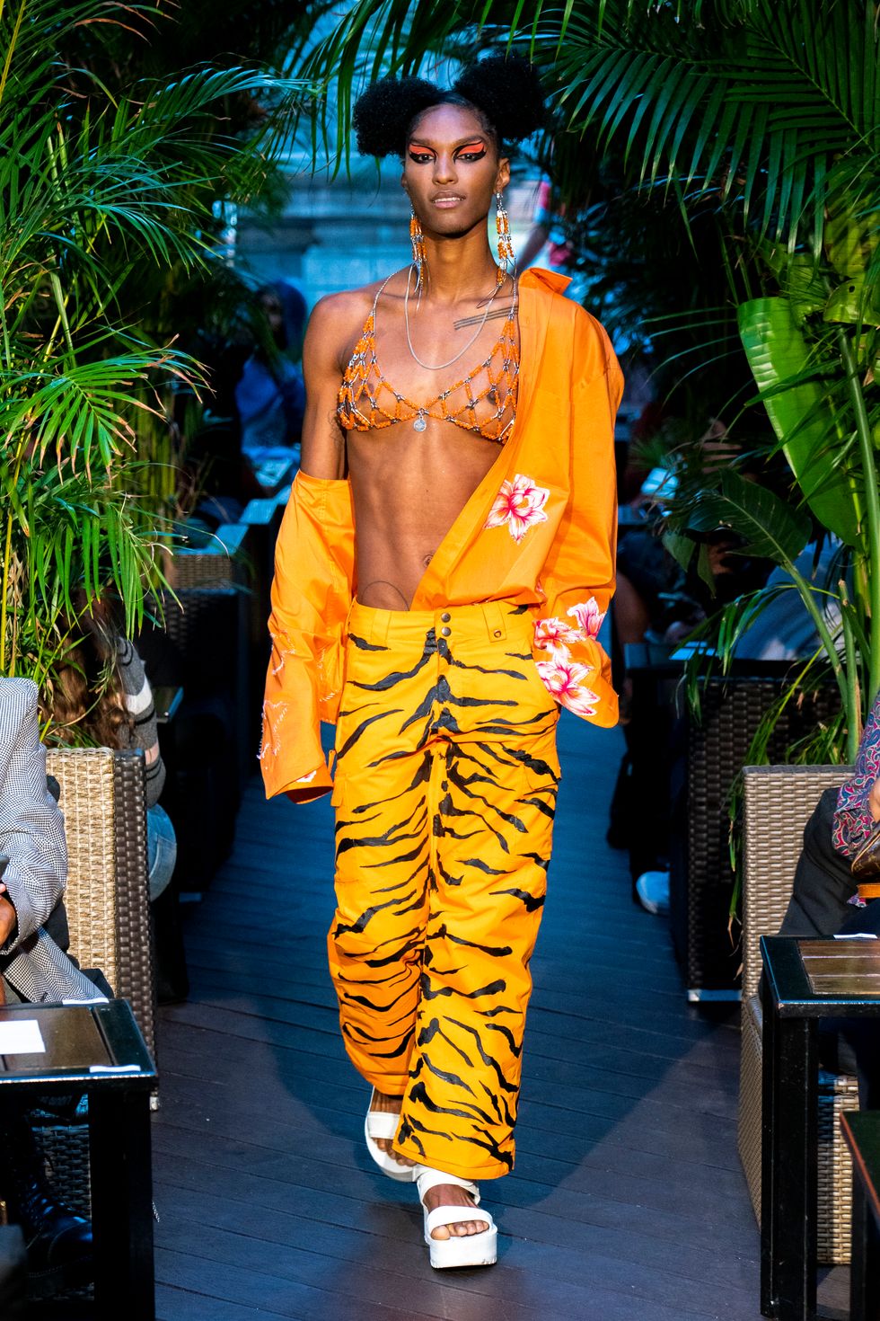 Models would complete their prowls to the futuristic funk instrumentals of Aaliyah and Missy Elliott tracks. Then, every so often, an alien-esque being would come forward, as if beamed down from Mars. Their skin was made entirely of shimmering glitter, and they were there to transport audience members into another realm, whether here on Earth or to the next dimension.