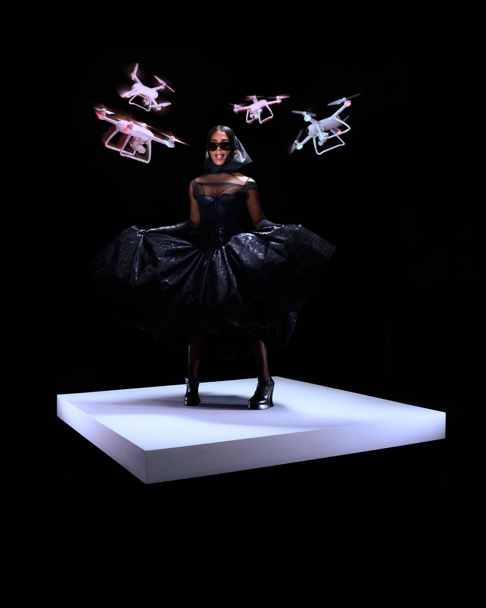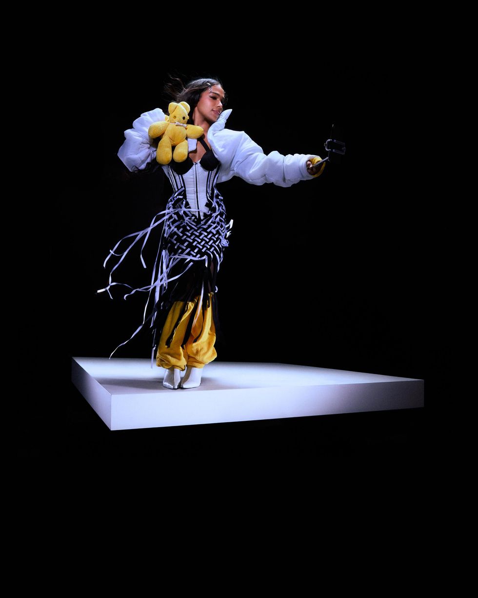 Skirt and corset: Wiederhoeft, Bodysuit: Nihl, Shoes: Fluevog, Headpiece: Elena Velez, Sunglasses: Balenciaga