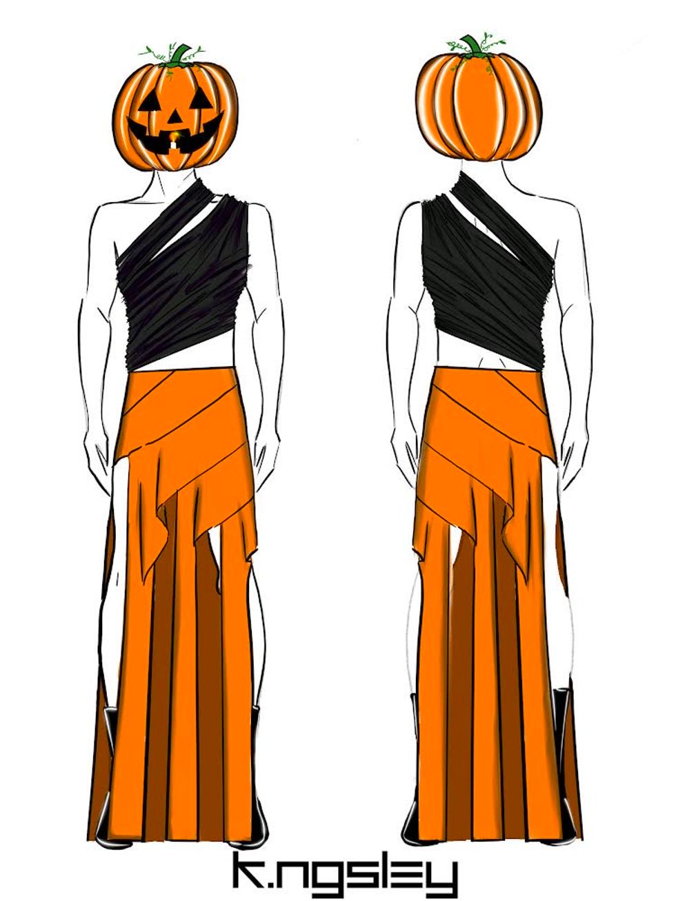 K.nsgley looked to the ubiquitous jack-o'-lantern for his costume idea. "This sketch is Look 28 from the most recent show, C3: DO YOU UNDERSTAND?, which debuted on October 21, with a nod to Halloween’s most recognizable figure the Jack-O-lantern inspiring the color palette of the look, as well."