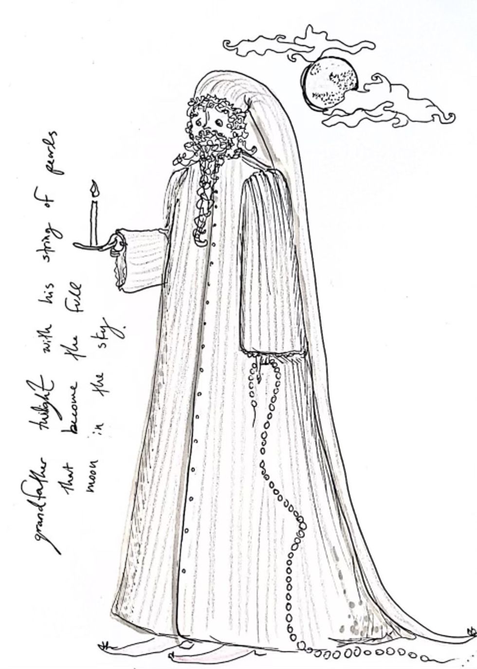 Zoe Gustavia Anna Whalen was drawn to Grandfather Twilight. "I drew a little sketch of Grandfather Twilight in his nightcap and gown, holding a string of pearls, one of which becomes the full moon once a month when he walks to the ocean and puts a pearl up into the sky. A soft old man living in the forest, with a giant string of pearls, somehow always in his beautiful night dress."