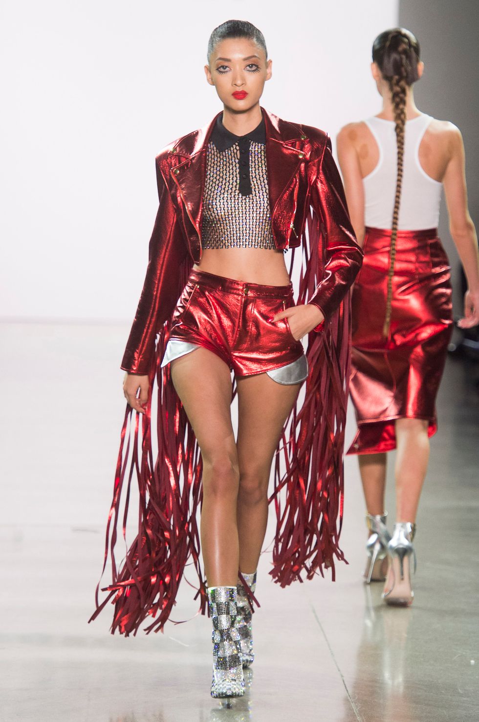 Margo Robbie's portrayal of Joker's accomplice Harley Quinn in Suicide Squad has fans fully invested in Quinn cosplay. With a powdered face and bold lip, Christian Cowan's metallic jacket and hot pants in fiery red are luxe trade-in for costume store version.
