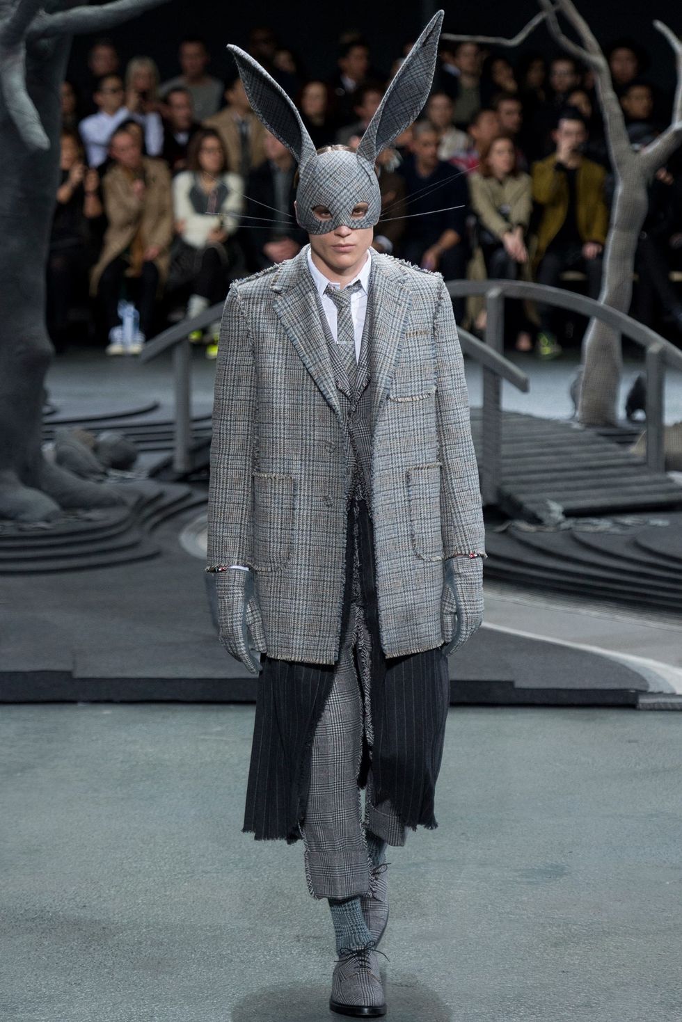 If White Rabbit from Alice's Adventures In Wonderland was a regular at The Pool, Thom Browne would be his go-to suit maker. Stephen Jones' glen plaid mask, complete with pointy whiskers, turns the sweet bunny rabbit into a slightly sinister masquerade caricature.