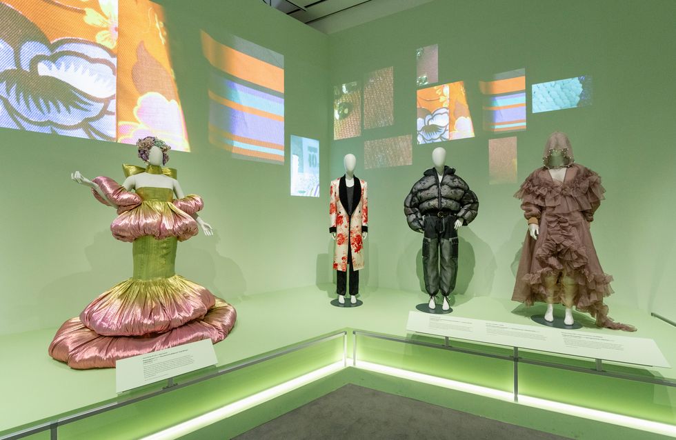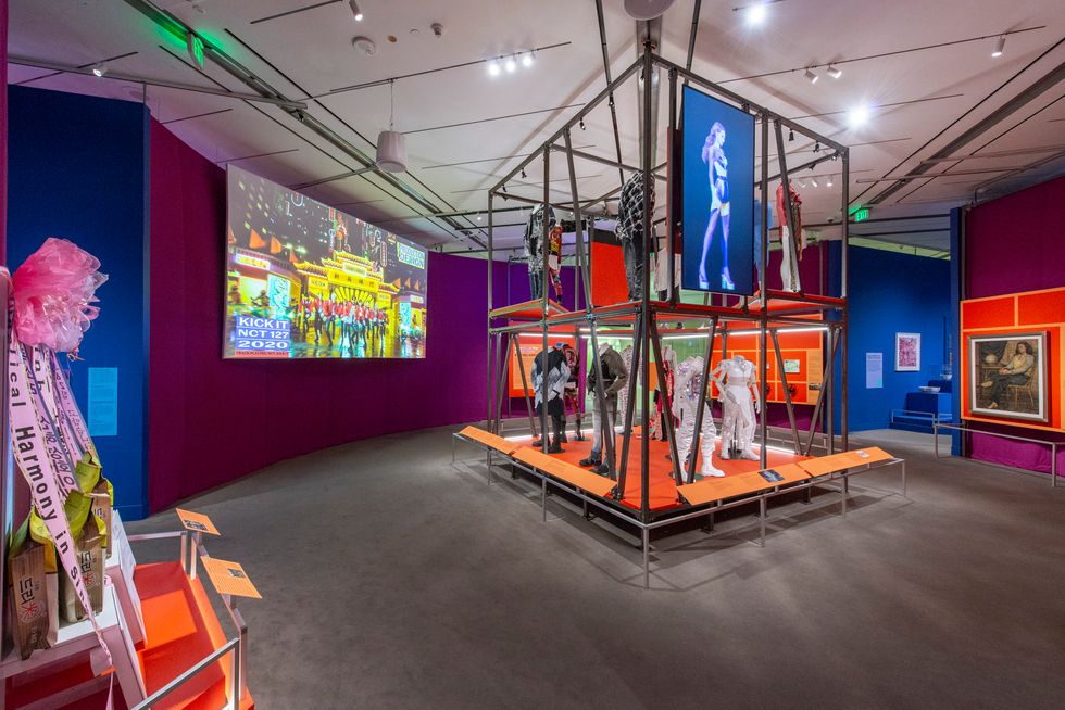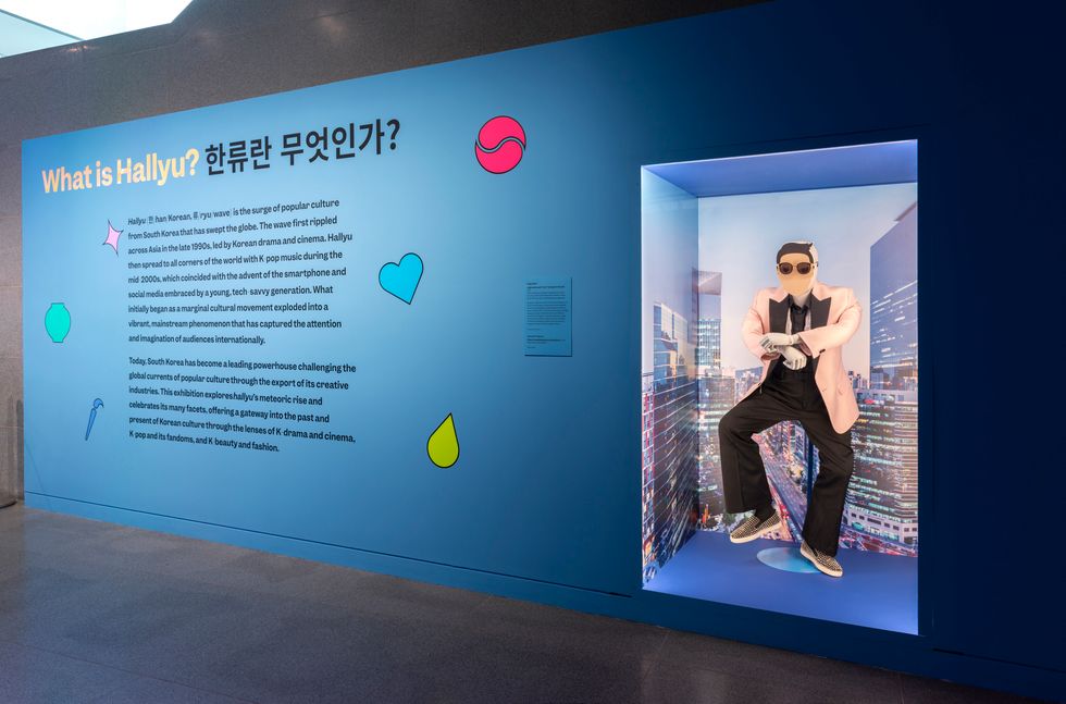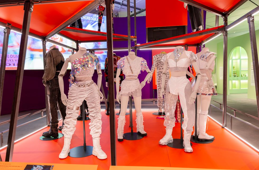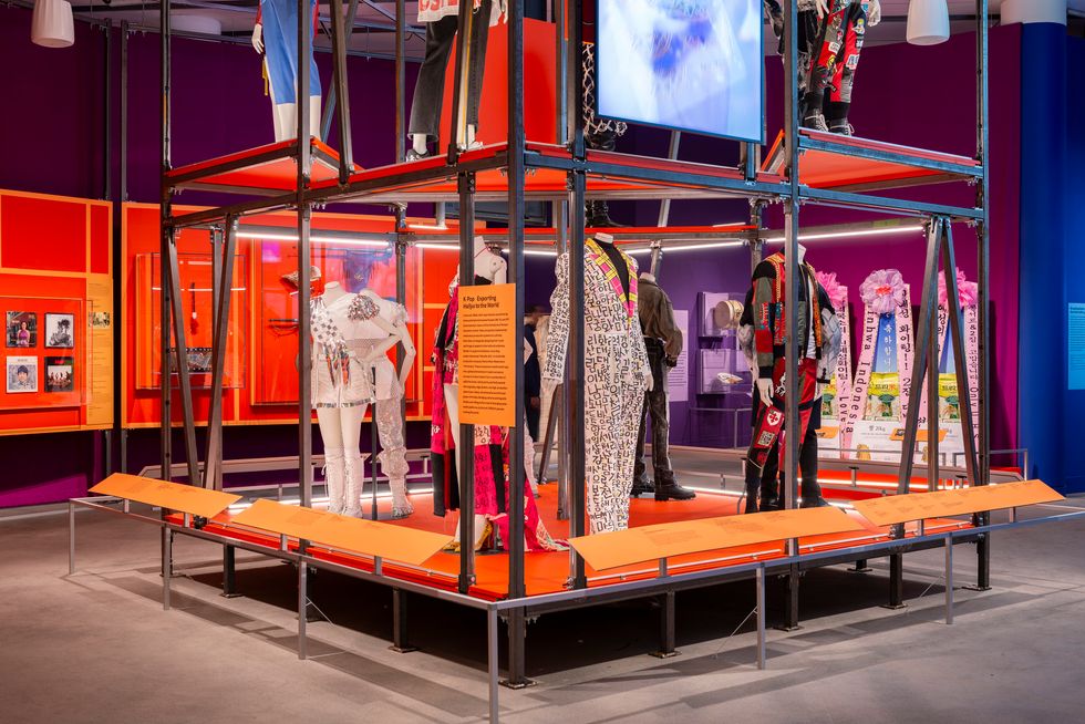 For an exhibition of pop culture to work, you not only need to recreate the energy of that moment but position static objects so that they seem just as exciting themselves. In this respect, Hallyu! only ever succeeds half of the time. The show opens with the tuxedo PSY wore for “Gangnam Style,” which probably remains K-pop’s high watermark in America to this day. The song really only became a hit off the back of its music video’s goofy, dead-pan swagger and shamelessly party-starting EDM beat: who cared about that suit? Even though “Gangnam Style’s” spoof of tacky consumerism is a great lens into the country’s progress, left on a mannequin, the rapper’s outfit is virtually indistinguishable from ‘80s prom-wear. This is also true of the punk look once worn by ATEEZ. Without anything but some wall text to properly introduce who they are (ahem), it’d be tempting to look at the lifeless mannequins sporting their clothes and think the group are rebels without a cause.