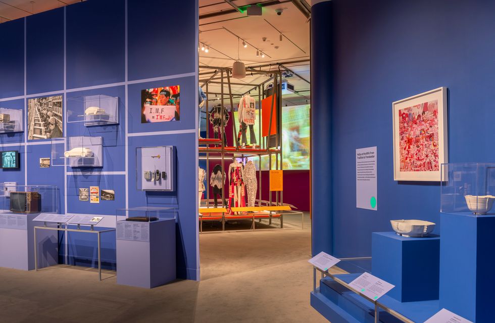 The main focus of “Hallyu!” is the period that followed the country’s chaotic 20th century, and, like the exclamation mark in the title suggests, this exhibition is a celebration! South Korea as a global economic and cultural power! South Korea as the last bastion of girl groups and boy bands! South Korea as a shorthand for glamor and quality and excitement! But in its eagerness to tackle every aspect of South Korea’s boom, we’re left with both too much and too little: an exhaustive and exhausting survey of the country’s off-the-charts creativity that’s still riddled with cracks in its creamy, skincare-addicted facade.