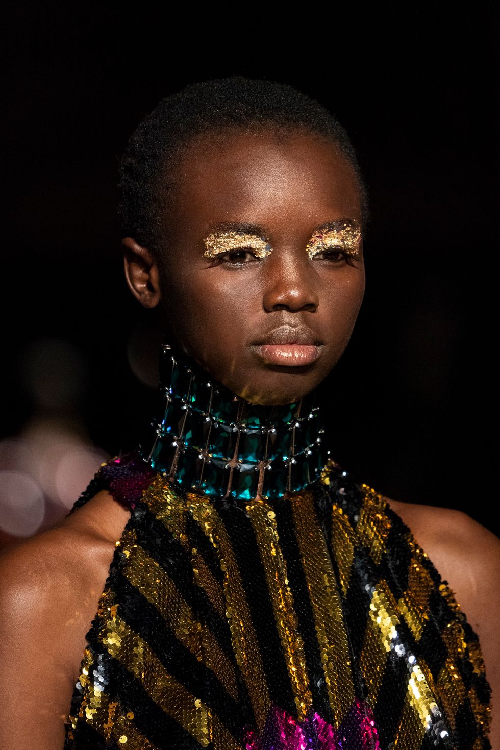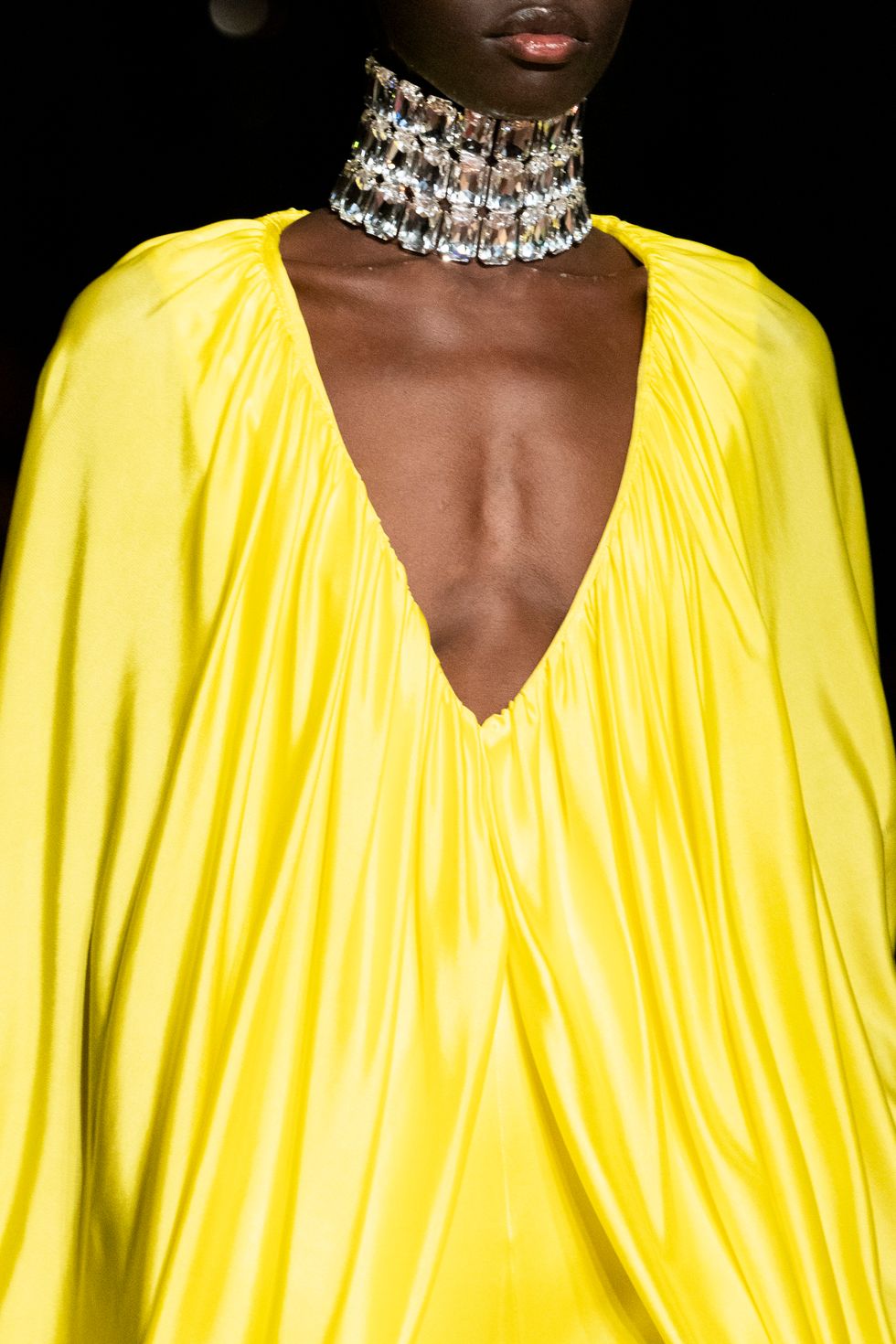 Some of the most dramatic pieces of the collection were the thick crystal chokers that covered the models' entire necks. Some were used as an added extension to dresses while others were worn as solo accessories that amped up an already super glam collection.