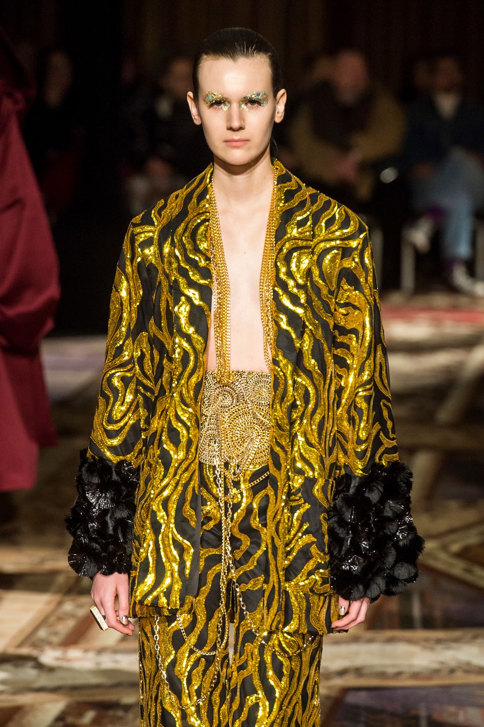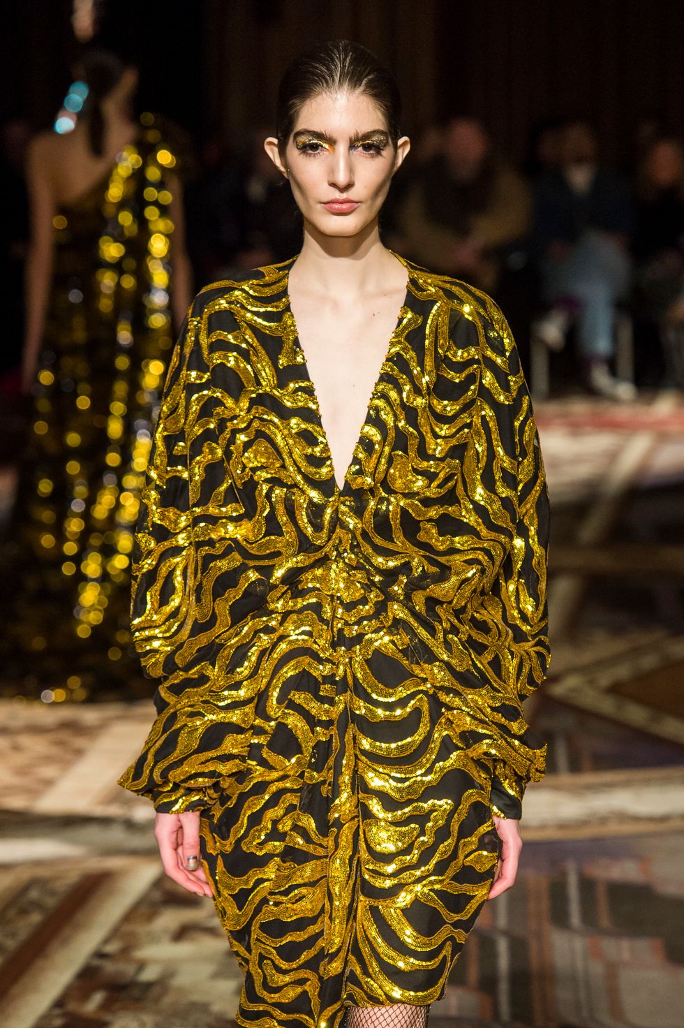Designer Michael Halpern only graduated from Central Saint Martins in 2016, but the label has already become a household name of sorts and an instant go-to for sequined pieces reminiscent of disco days. For his fall 2019 collection, he sent a series of transformational dresses — including those that looked like metallic sunrises, golden gardens and glittering chests of ancient treasure — down the runway. Here's everything you need to know about the show.
