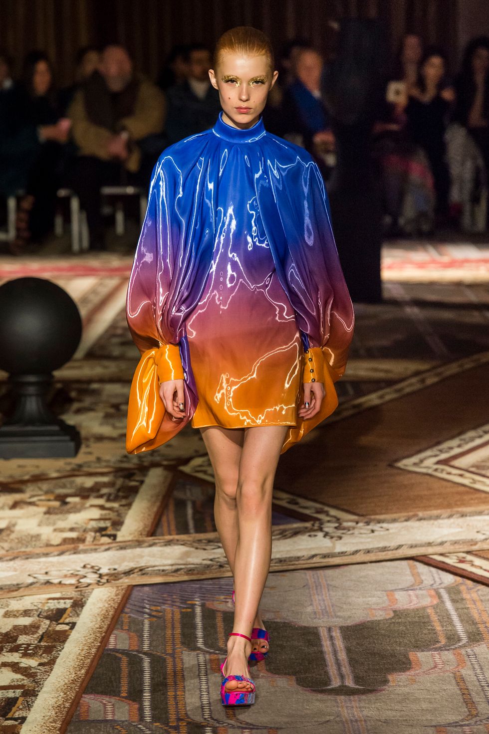 Two of the most dynamic pieces in the collection were a sunset meets sunrise hued dress and top. Made of a slinky fabric, each outfit looked almost liquified.