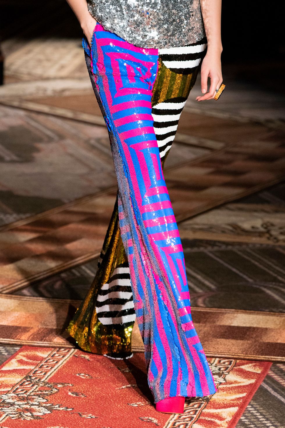A dramatic hooded cape with geometric block print and metallic leopard spots opened the show. Later on, an equally theatric burgundy hooded cape was worn over a gold sequins mini dress for modern Little Red Riding Hood vibes.