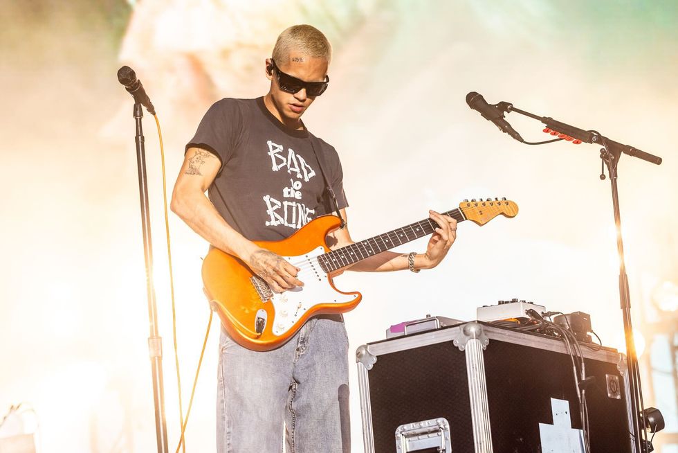 I wore jeans and a little cropped Lady Gaga “Monster Ball” tour t-shirt Friday, abs out, Vans checker slip-ons half on my feet. I was overdressed, of course, as most of the bikini and board shorts and mesh cover-up compatriots in the crowds around me clearly communicated with their eyes. I probably would have joined them, had I not been on the job. Still, Hangout Fest might be the only place on this earth where I’d do said job in a bikini. Emphasis on might. Ducking and dodging around sloshing beers and pizza slices and ice cream cones, I sampled the various activations. Club, another club, as Lady Gaga always says, except here the club is the Takis tent and the 7-11 Slurpee truck. I sat sipping a white can of Monster in the SHEIN beach club, and wrote in my notes: Has anyone cruised in the SHEIN beach club? I found my way over to an Acai Bowl vendor, ordered extra fruit, and wandered into the VIP areas, where the not-yet-sunburned lounged in pop-up pools and on palatial, shaded verandas. The white can Monster wasn’t enough, so I grabbed a cold brew from the refreshments stand back behind the verandas, and ducked into the artist’s compound to meet my handlers.