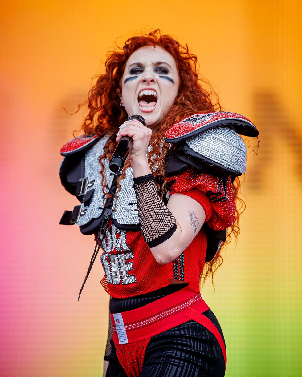 Shortly before 3 PM, I ducked into Dasha’s pit with Sara. The crowd hummed excitedly, and she emerged from the side stage to rapturous cheers. While most might know “Austin,” even Dasha seemed surprised at how much of the crowd knew the words to her other tracks. As fans clambered onstage with her to line dance, Sara and I dashed behind to the road Lana had driven on the night before, a shortcut to the mainstage for Chappell Roan's set. Weaving through photographers and pink cowgirl hats, we crouched, and then gasped with everyone else when Roan showed up in football padding and a jockstrap. Smart references, as always, like the Lady Miss Kier drag at Coachella. More than that, though, her performance capabilities are unmistakable. For a brief second, I really did think she’d been possessed by the crazed theatrical spirit that once haunted Lady Gaga.