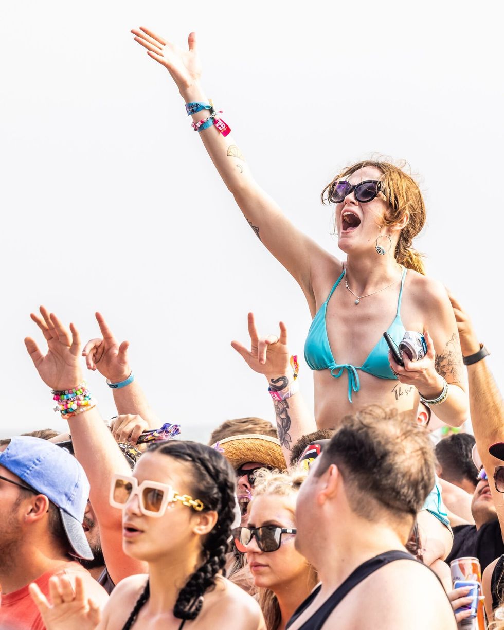 This being the Gulf, the air was thick with the anticipation of thunder, and I spent my time between performances listening in on radios about the local storm watchers, lazily munching on Takis tucked into my purse and gossiping with the publicists about most things. It was, crowds considered, the most relaxed I’d ever been at a festival, let alone one I worked at. The line-up was diverse, and there was a distinct sense of adventure winding my way through surf and sand to the various stages, eager fans pressed as close as they possibly could be to artists both familiar and new to me. G Flip was explosive in person; the music off their last album Drummer translated perfectly to the wide open spaces of the Gulf Shores, as if it’d been recorded here in the first place. The Beaches were high energy, and NLE Choppa put on a great set, crowd dancing about as hard as they later would for Sexxy Red and Doechii. Dominic Fike, a favorite of PAPER’s music crew — and Sara, who practically ran to his pit — was also a surprise.