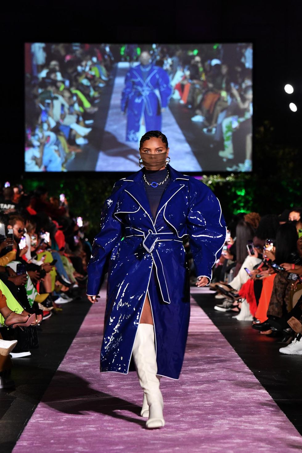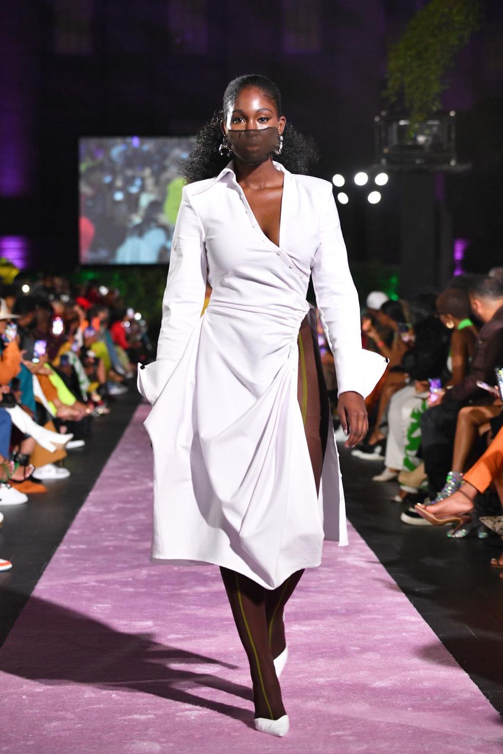 In choosing the American capital (where she is based), the CFDA/Vogue Fashion Fund recipient paid homage to her heritage—her family came to the city after migrating from the Democratic Republic of Congo. Much of what Mvuemba creates is tied to her background, as seen in the introduction video before the show started. The video gave a glance back into her start in 2011 as well as her viral 3-D fashion show during the pandemic.