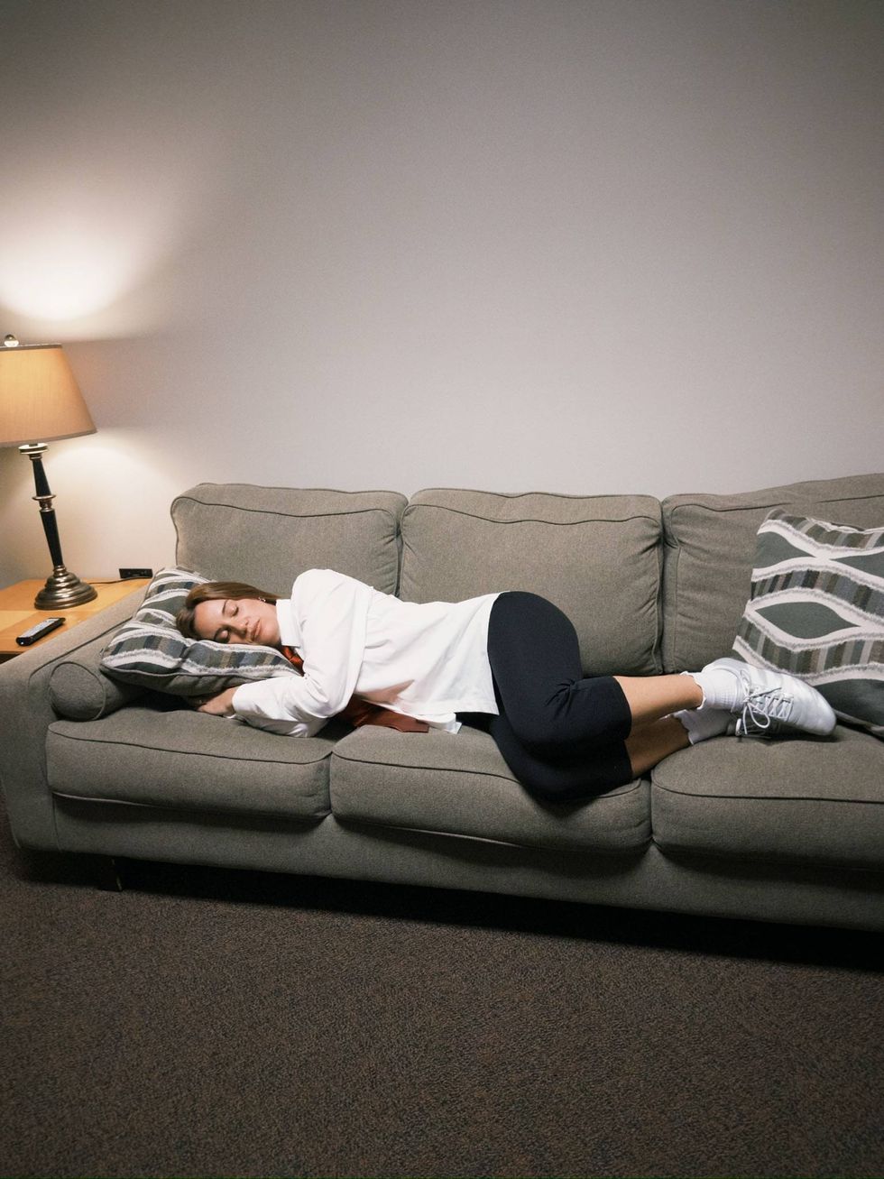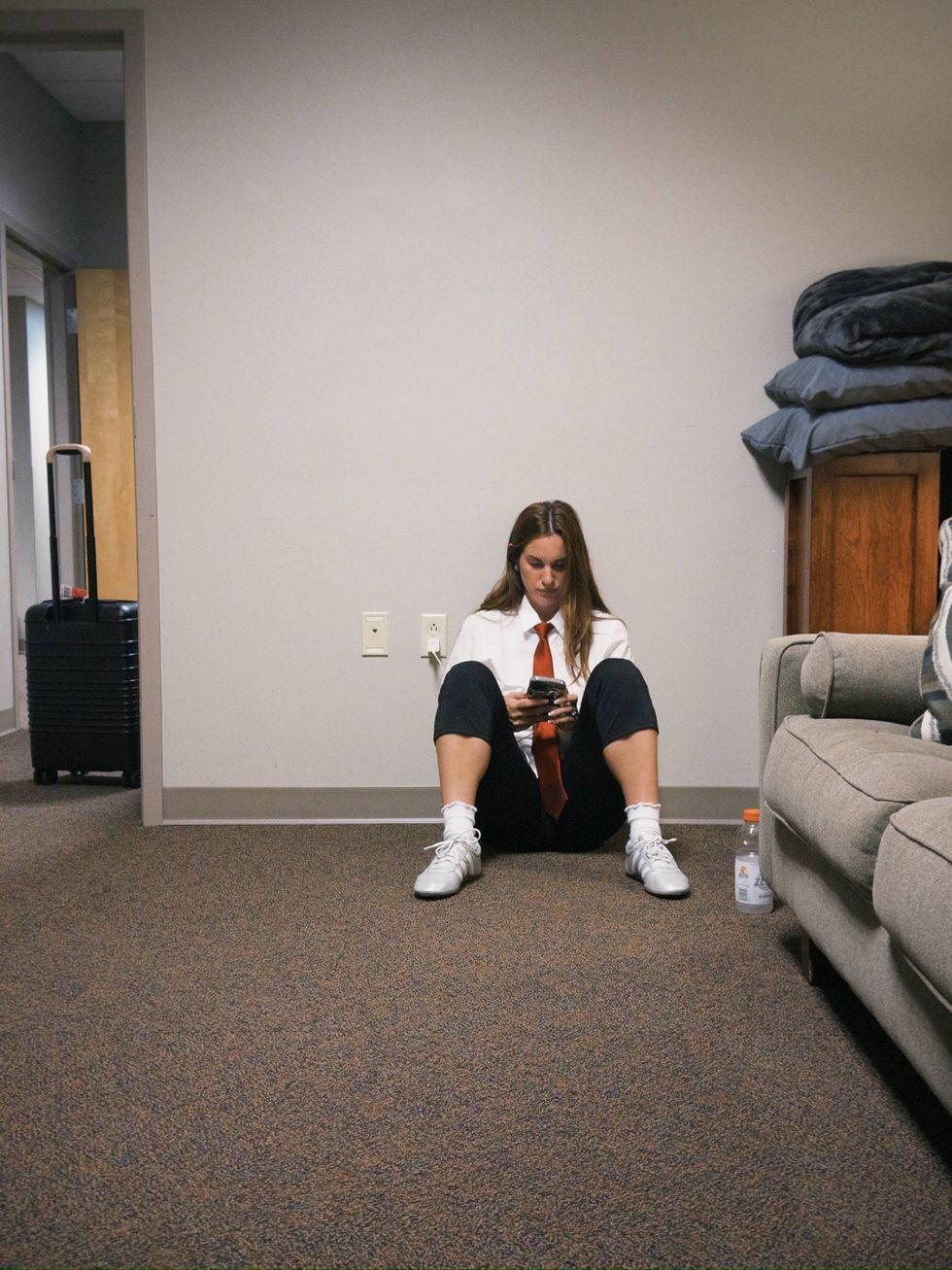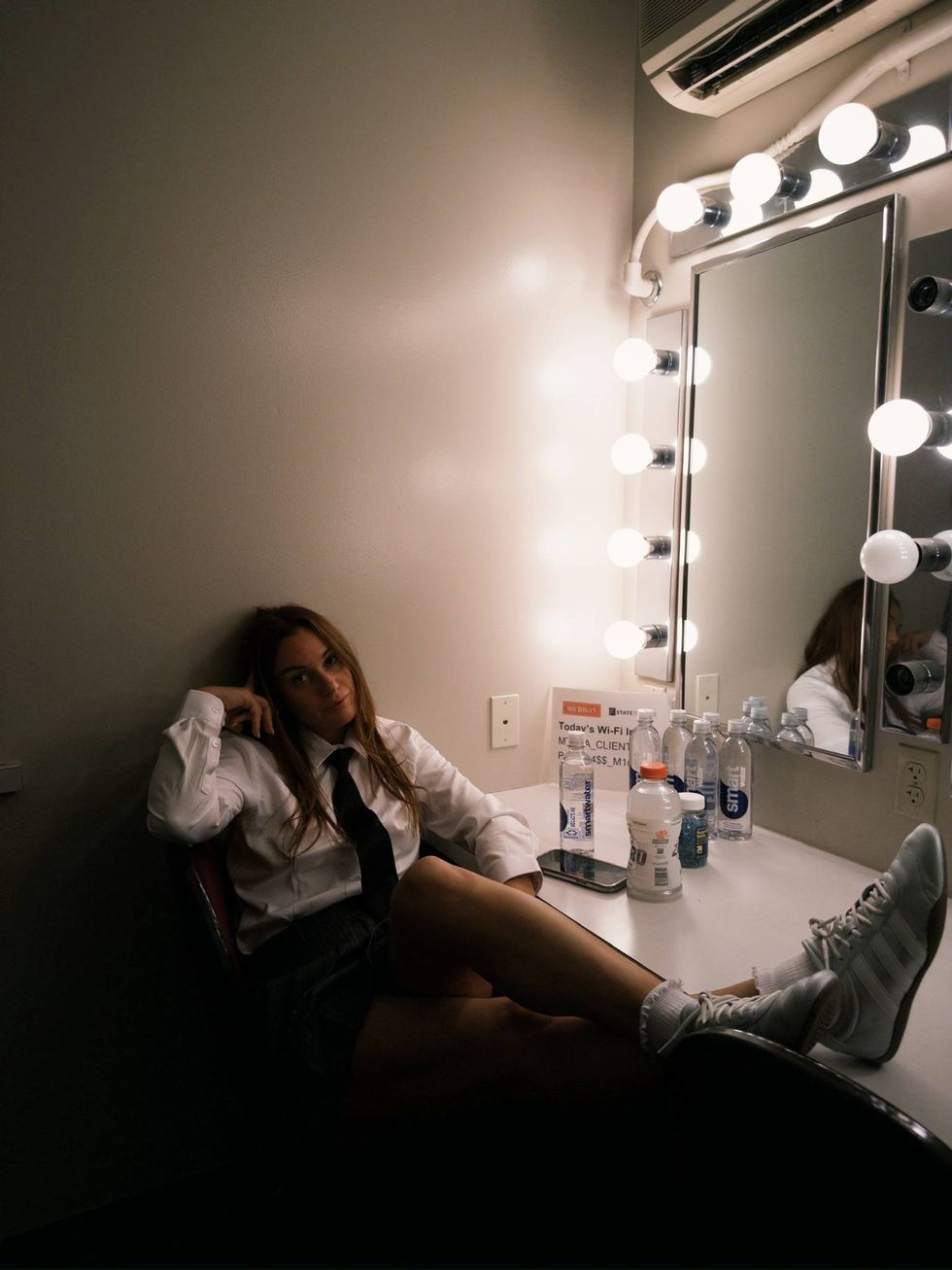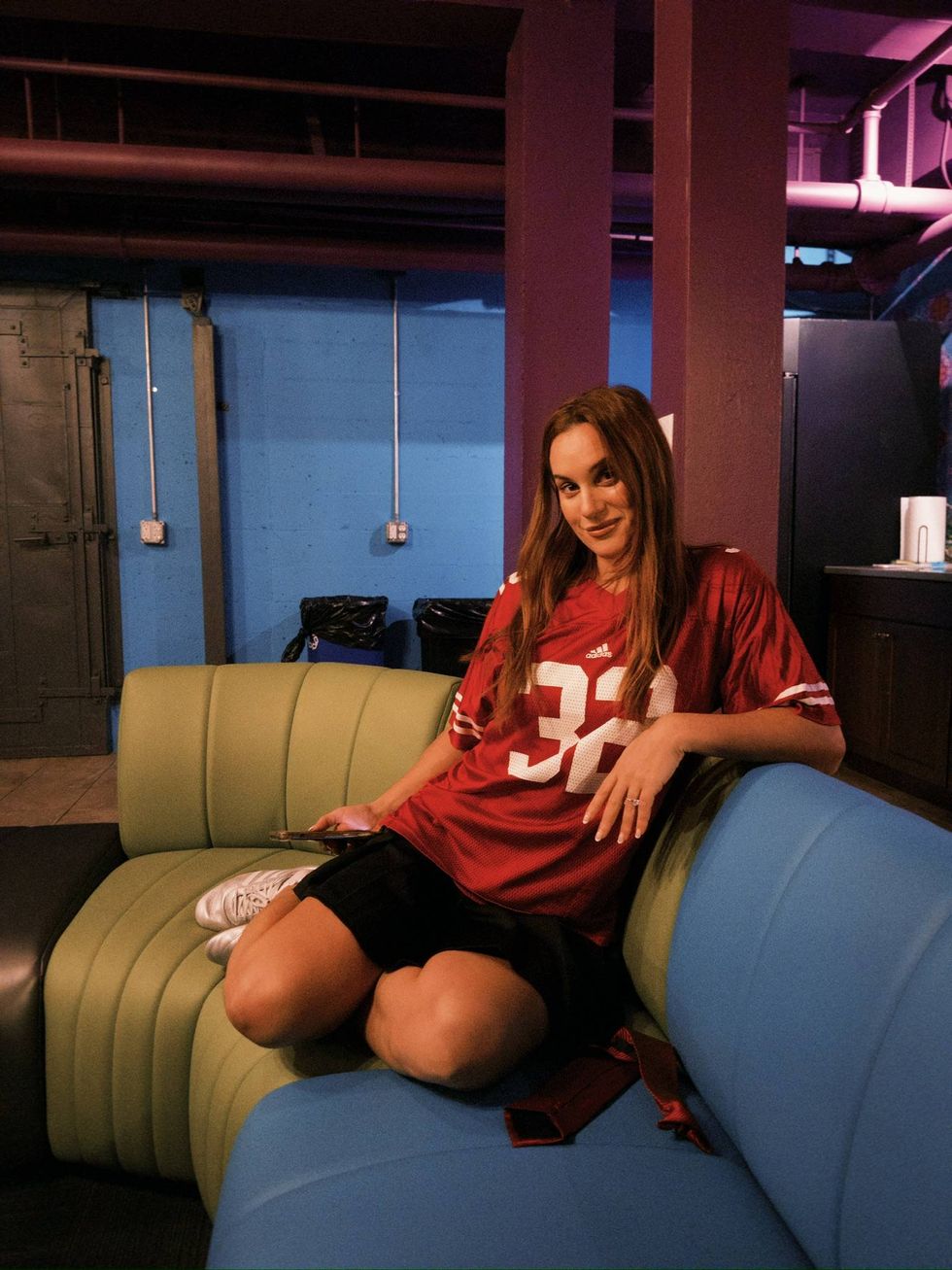"In the green room before my Madison show! Fun fact, most green rooms aren’t green. I bought this jersey at a thrift store that day just to add some school spirit to the show."