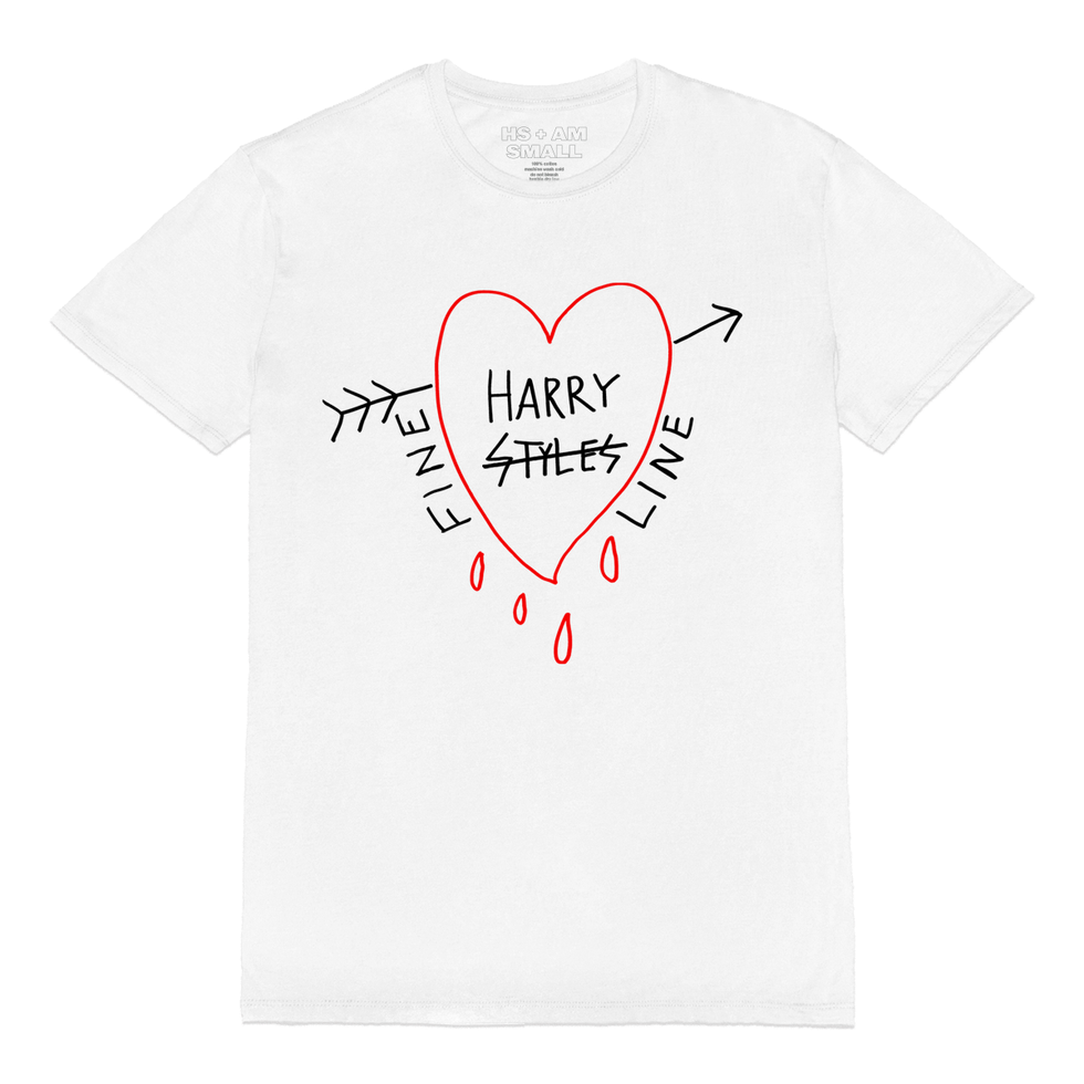 Both parties have joined forces on a new T-shirt in celebration of Styles' latest album, Fine Line. The simple white tee features an illustration of a large heart with an arrow running through the middle, with what appears to be drops of blood falling below. Styles' last name is crossed out as "Fine Line" surrounds the heart on either side.
