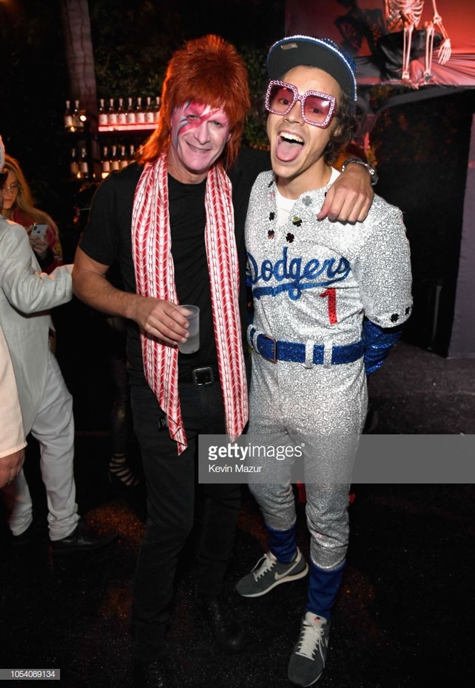 Harry wore the sequined version of the blue and white baseball uniform, completely with a sequined baseball cap, and Sir Elton’s huge signature rhinestone-studded glasses in pink. He was also spotted at the Beverly Hills bash with Cindy Crawford’s husband Rande Gerber, who paid tribute to “Rocket Man” David Bowie.