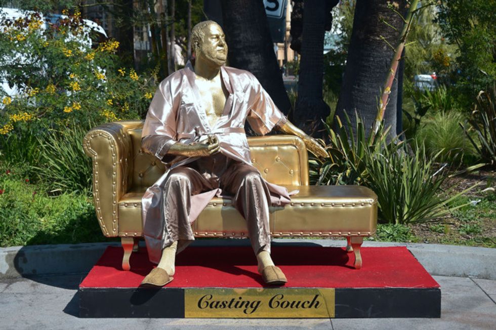Just when you thought it was safe to return to Hollywood, a giant golden Harvey Weinstein atop a "casting couch" has been erected (gross).