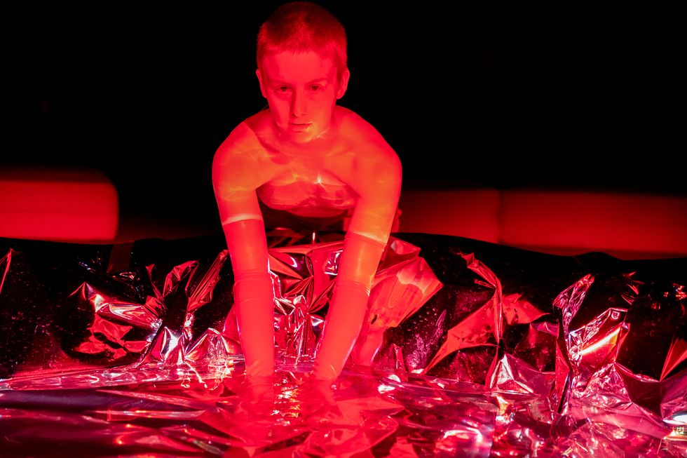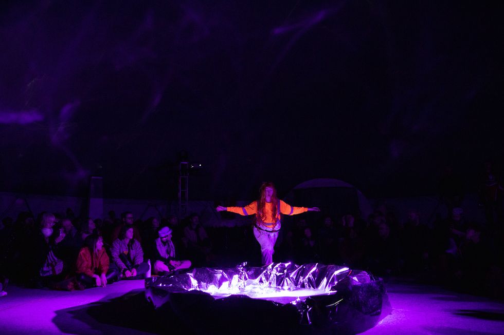 Two performers, outfitted in wings, stood firmly at opposing ends of the scene, watching over the other characters. Acting powerhouse Bobbi Salvör Menuez, who appeared in Amazon Originals' Transparent and I Love Dick, stood rigid against the dome, a backdrop of multi-colored film filling the negative space behind them. Menuez moved slowly toward the center of the dome towards a pool of water contained in a foiled basin before washing their face. Dunham emerged at one point in a long red wig, balanced out only by another performer who pulled at a rope around her waist before she fell forward into darkness.