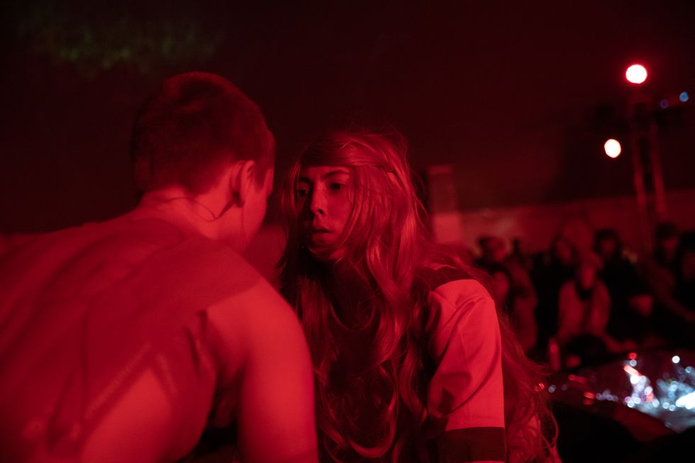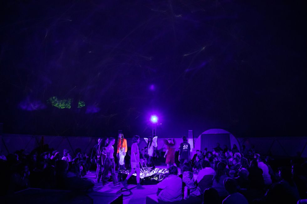 Two performers, outfitted in wings, stood firmly at opposing ends of the scene, watching over the other characters. Acting powerhouse Bobbi Salvör Menuez, who appeared in Amazon Originals' Transparent and I Love Dick, stood rigid against the dome, a backdrop of multi-colored film filling the negative space behind them. Menuez moved slowly toward the center of the dome towards a pool of water contained in a foiled basin before washing their face. Dunham emerged at one point in a long red wig, balanced out only by another performer who pulled at a rope around her waist before she fell forward into darkness.